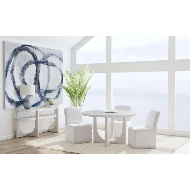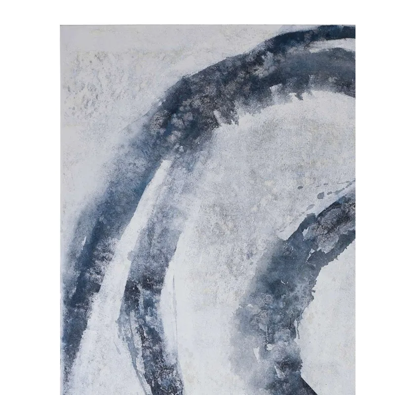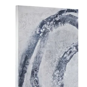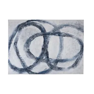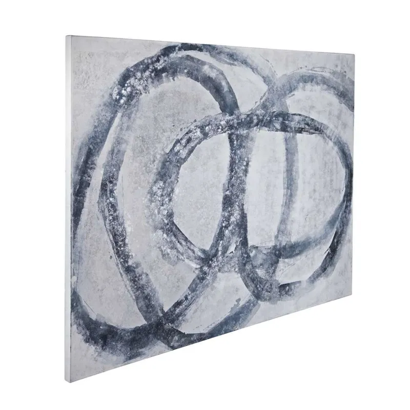 Altarium is a canvas featuring bold, looping brushstrokes in layered gray and blue tones across a textured background. The abstract composition can be displayed vertically or horizontally for flexible presentation.