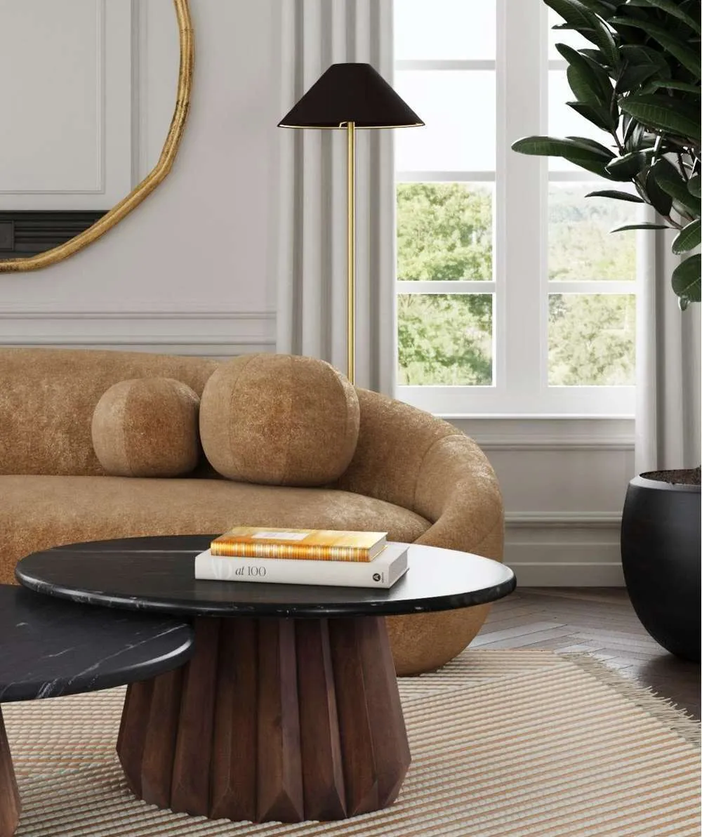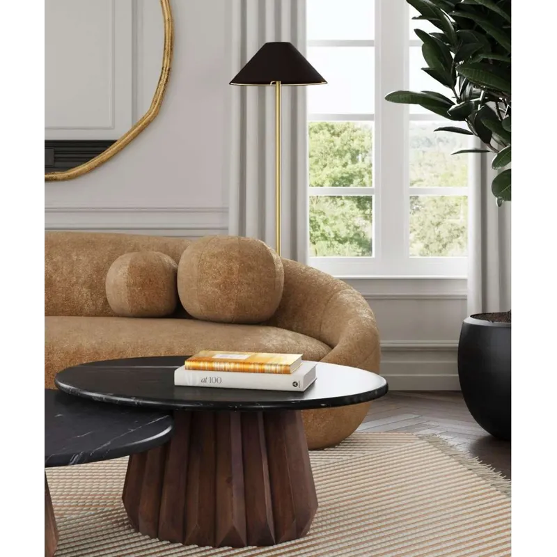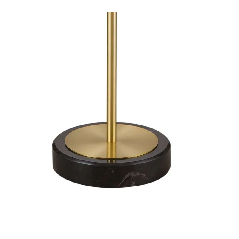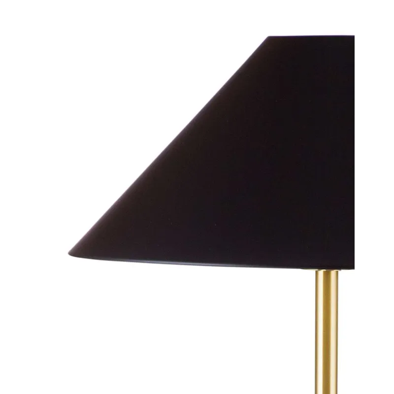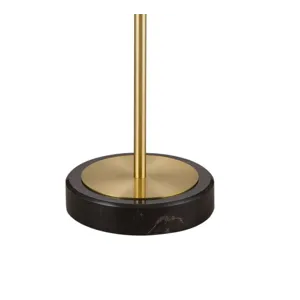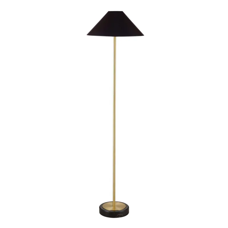 The Norfolk Floor Lamp exudes contemporary glam style, featuring a striking black marble base complemented by a sleek gold brass body. Its cone-shaped lamp shade, crafted from black metal, adds a sophisticated touch to any room. With its modern and timeless design, this lamp effortlessly combines elegance with functionality.