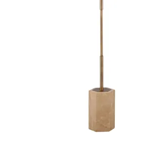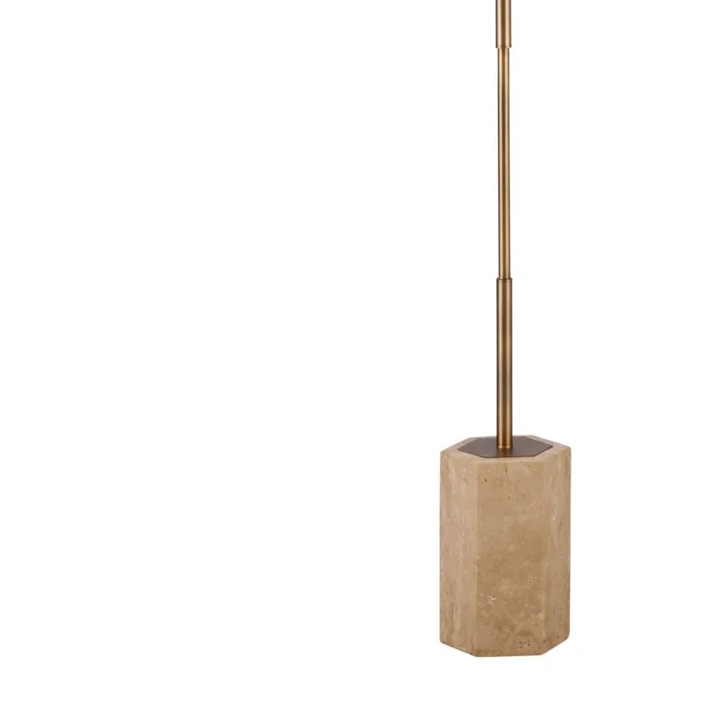 The Ronzell Floor lamp exudes natural charm with its travertine base and earthy hues, perfectly complemented by a tapered drum shade and brass accents. Its design effortlessly blends modern sophistication with bohemian aesthetics, adding a touch of warmth and character to any room. With its versatile appeal, this lamp seamlessly fits into various decor styles, from contemporary to eclectic. Crafted with attention to detail and quality materials, the Ronzell lamp is not just a source of light but also a stylish statement piece. Illuminate your space with inviting ambiance and timeless elegance with this exquisite floor lamp.