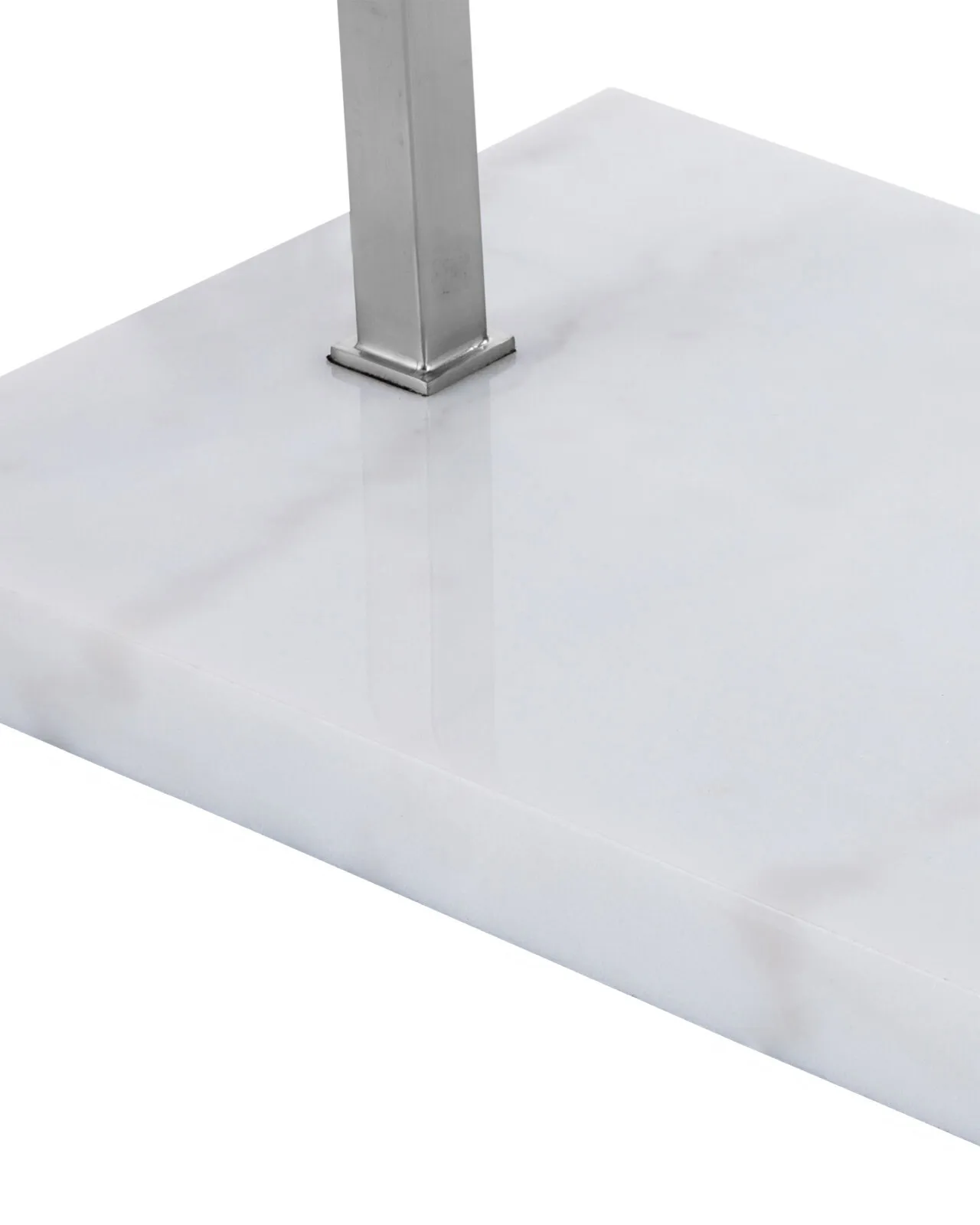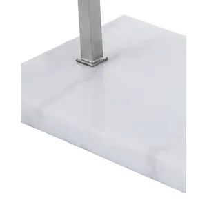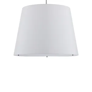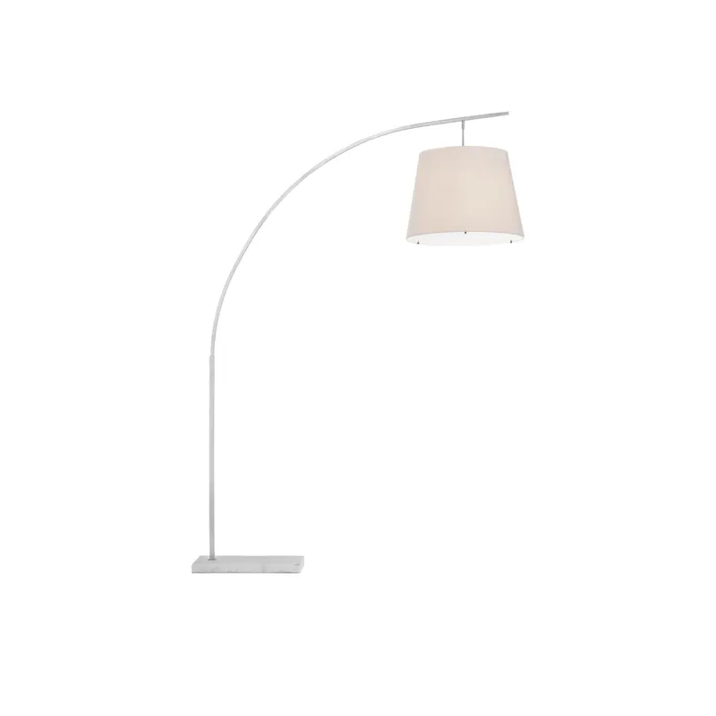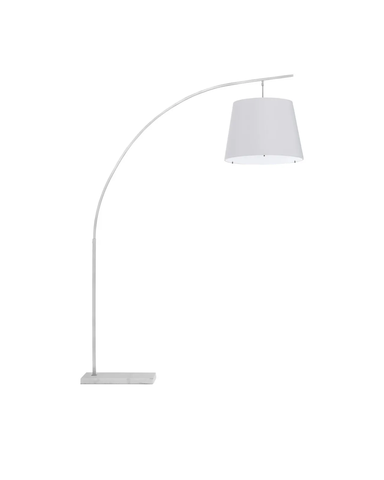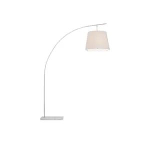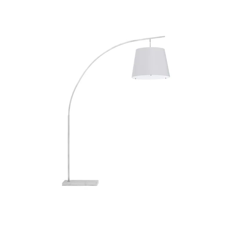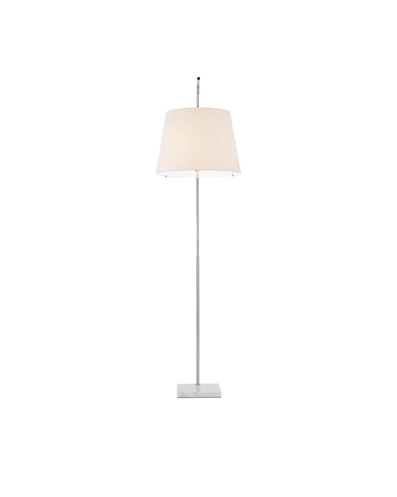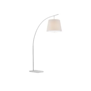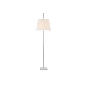 The angular arc of the stem on the Cloister Nickel Large Floor Lamp, the way the shade dangles, and the minimal shape of its base are design details that make it an exemplar of contemporary design. The clean way the stem is fastened to the base and the pared-down lines of the white linen shade enhance the silver floor lamp's modernity. The acrylic diffuser fastened by the petite button inial is a clever aspect to this design.