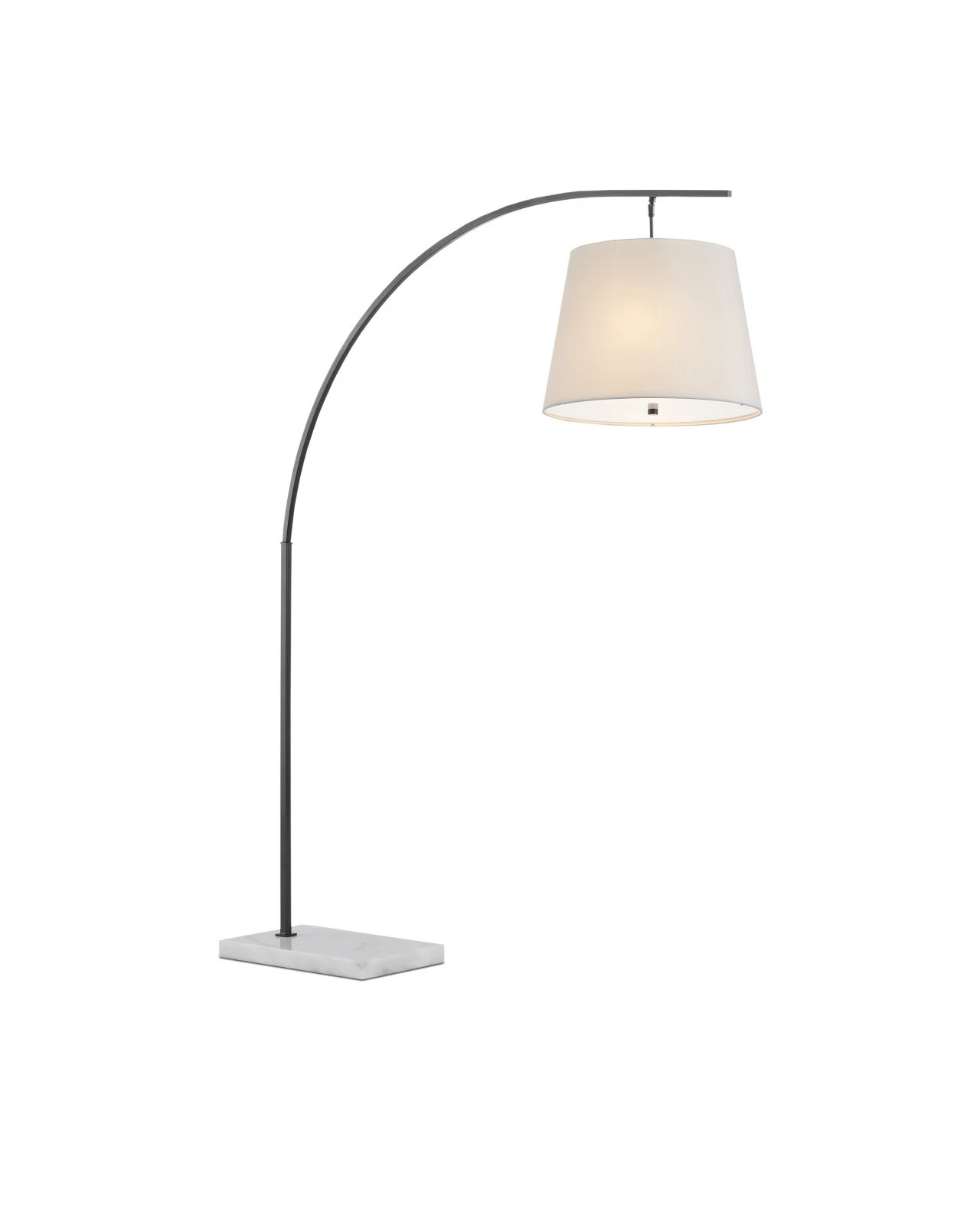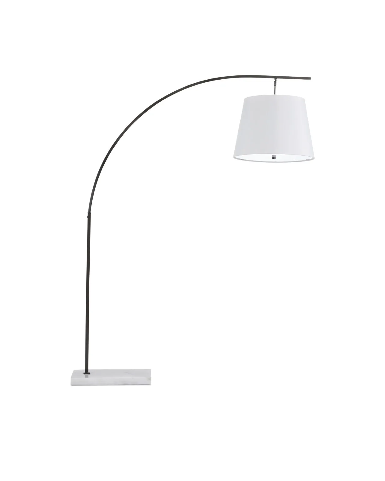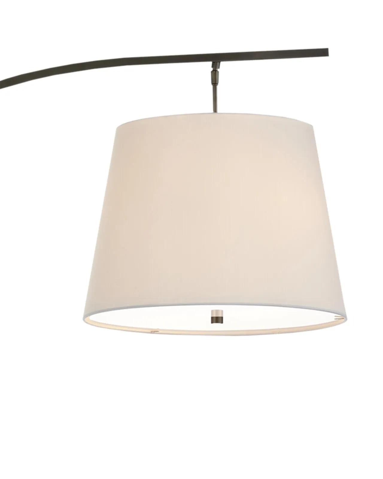 The angular arc of the stem of the Cloister Bronze Floor Lamp, the way the shade dangles, and the minimal shape of its base makes it an exemplar of contemporary design. The clean way the stem is fastened to the base and the pared-down lines of the white linen shade enhance the black floor lamp's modernity. The acrylic diffuser fastened by the petite button finial is a design detail of note.