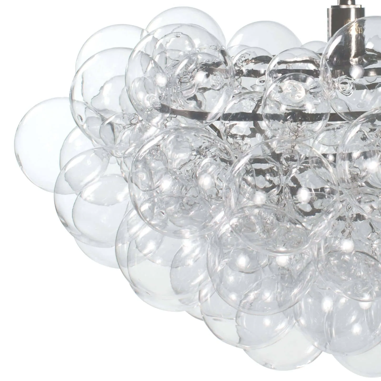 Light and airy the Bubbles chandelier radiates light through a cluster of hand blown glass globes. The brushed nickle frame lends a whimsical modern touch to a kitchen, entryway or foyer.