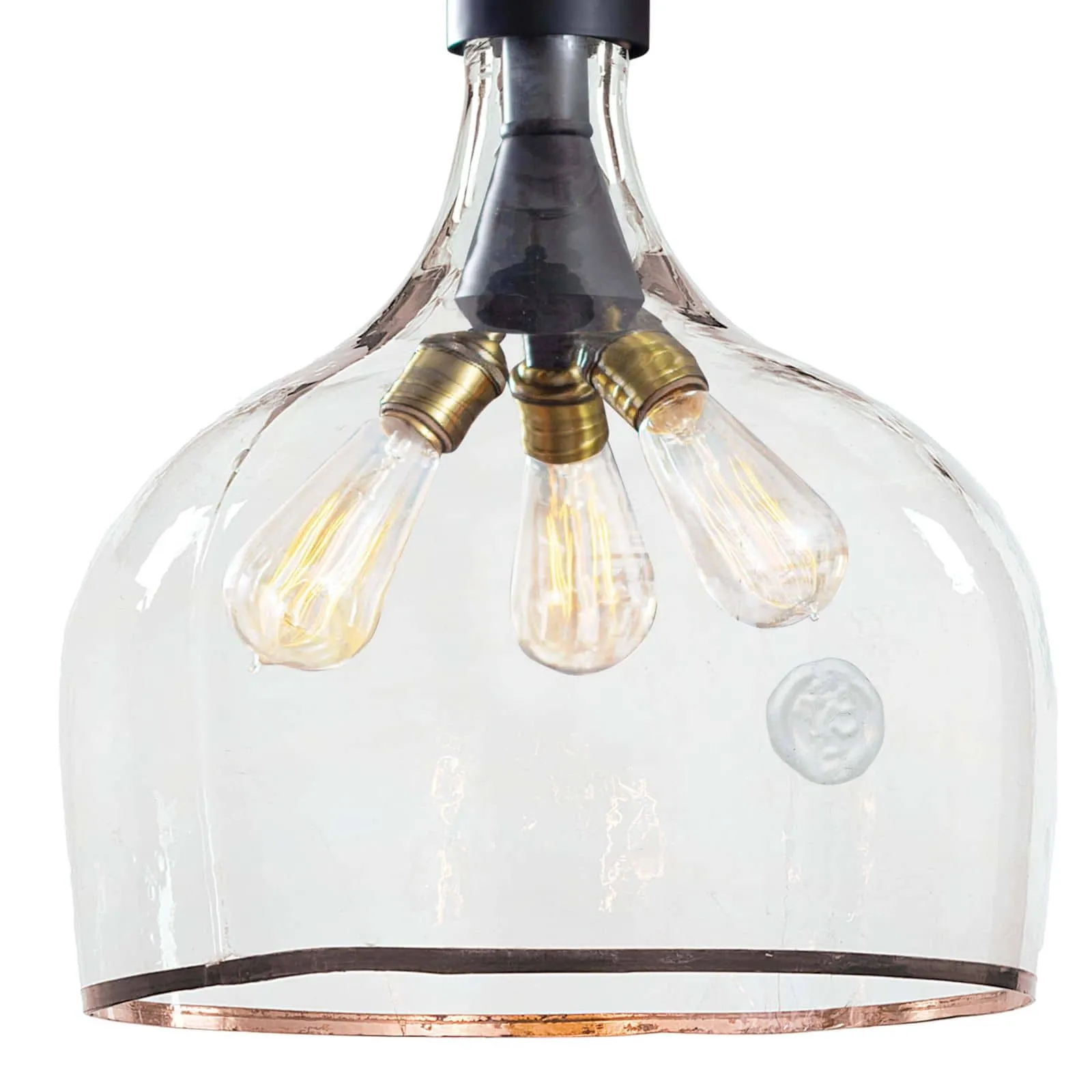 A subtly textured glass demi john bottle hangs from twisted jute rope to illuminate & add refreshing character over an island, sink or dining table.