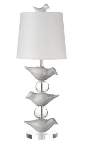 Three birds stacked up, interspersed with mouth blown clear glass balls. One little bird alights on the very top. The birds are papier mache, made from recycled materials.