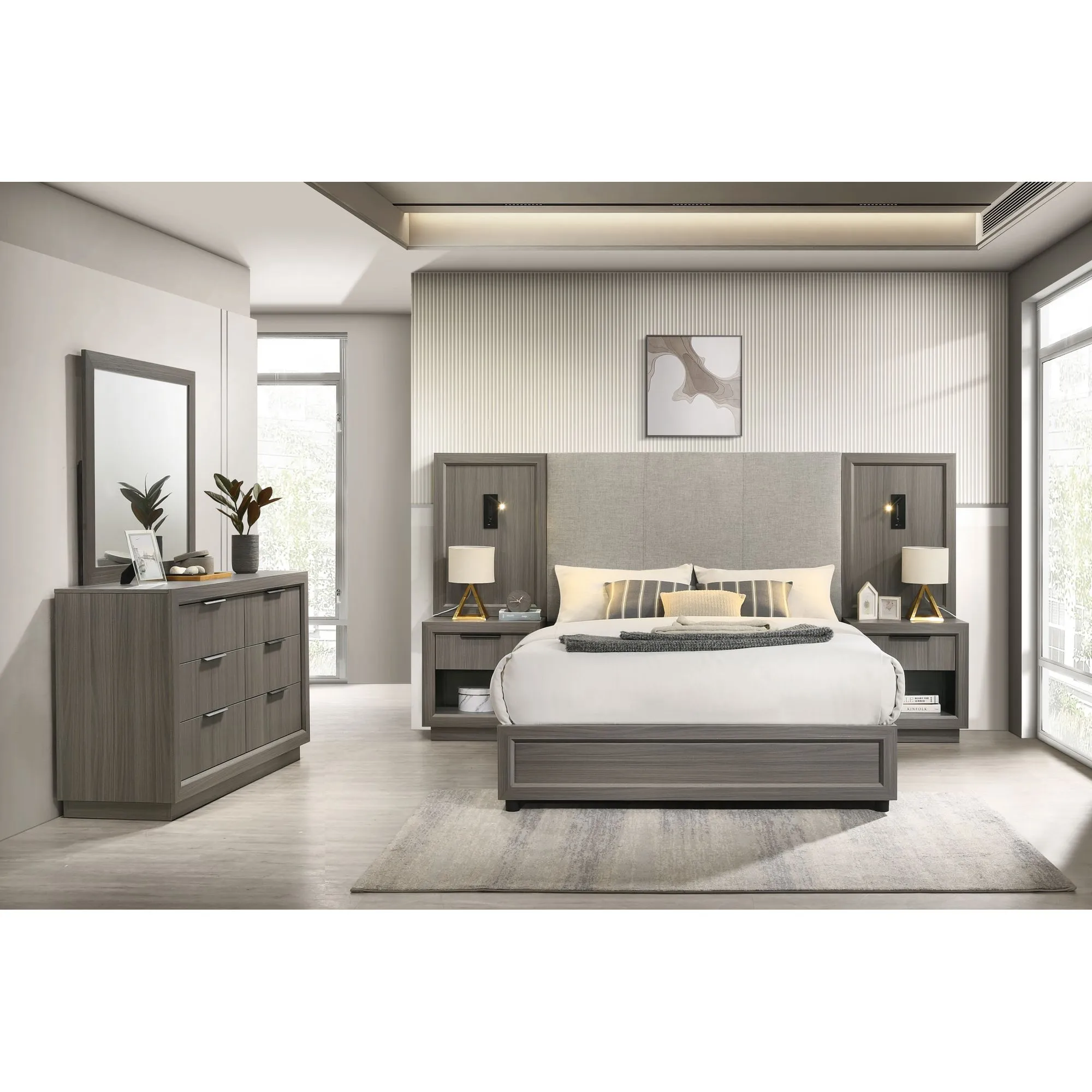 Matias Bedroom Set with Queen/Full Headboard, Dresser, Mirror & Nightstand in Mocha Grey