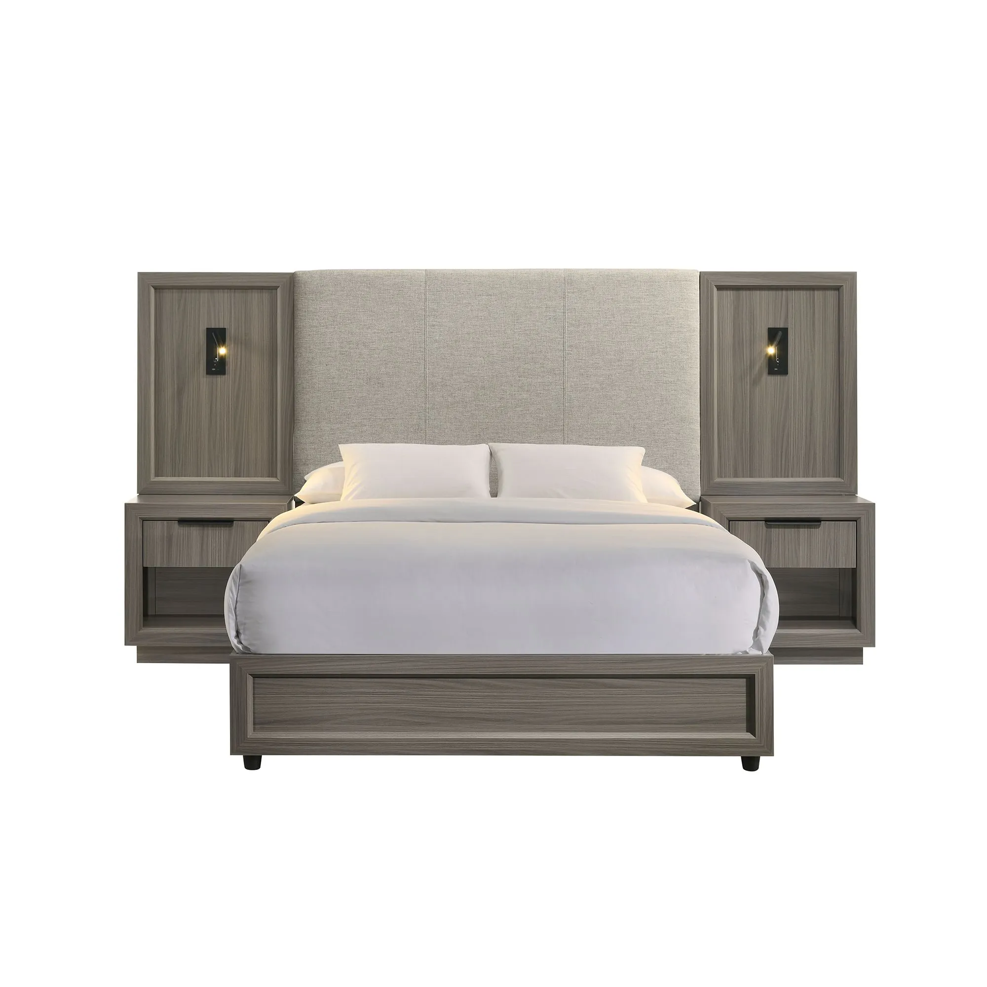 Martina King UPH Bed with Palmer Smoke Fabric, 2 Piers, and 2 Nightstands in Grey