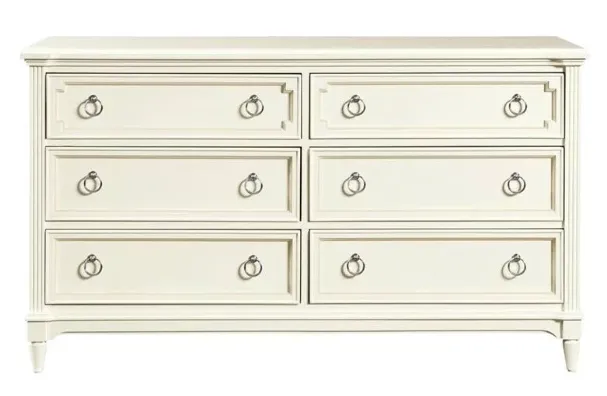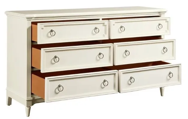 The Clementine Court Dresser lets girls have it all-stylishness and plenty of room for clothes, clothes and more clothes. Available in a luxuriant Frosting and Spoon finish with six English dovetailed drawers and brushed nickel hardware.