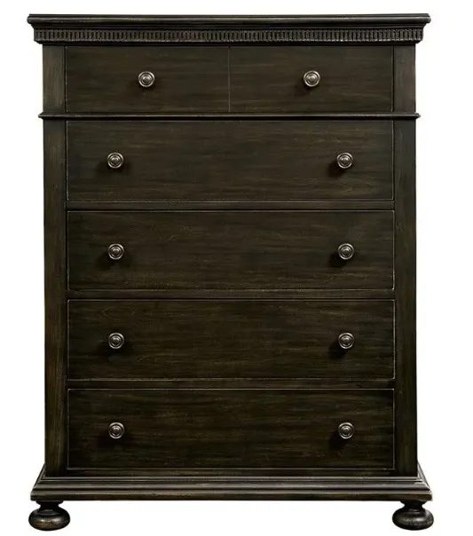 Cast in antiqued Licorice or Marshmallow finish with traditional detailing like fully-turned bun feet, the Smiling Hill Chest provides five ample-sized English dovetailed drawers to accommodate their ever-changing wardrobe.
