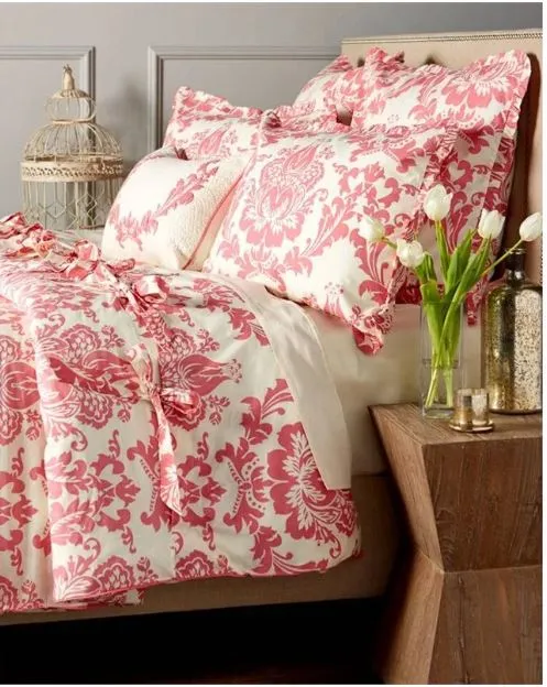 Unquilted damask coral and ivory print duvet cover. Opening of the duvet is halfway up with long wide ties.