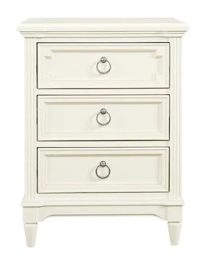 With its intricate wood detailing and luxuriant Spoon or Frosting finish, the Clementine Court Nightstand is a timeless addition to any bedroom. Features include three roomy, English dovetail drawers with brushed nickel drawer pulls and an inviting tabletop ready to be adorned with books and picture frames.