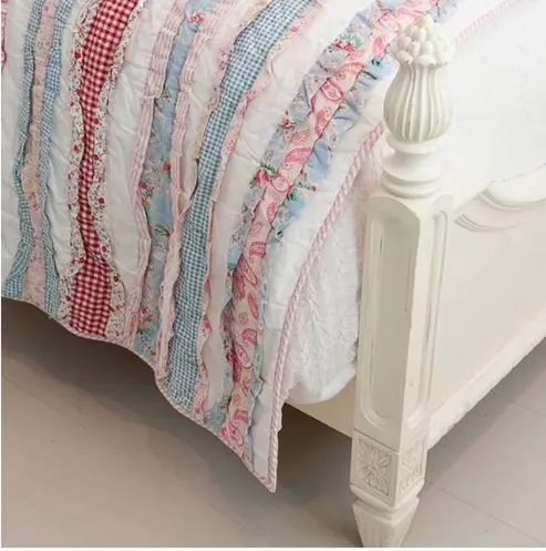 Soft pink cotton is quilted and pulled into sweet ruffles between light vintage prints that create a lively ensemble in the Lizzie Collection. This handmade quilt is crafted using an assortment of fabrics and some of the fabrics are individually made by adding ruffles to it. A fun quilt for any girls room. Transforming your home into a haven of warmth comfort and style.