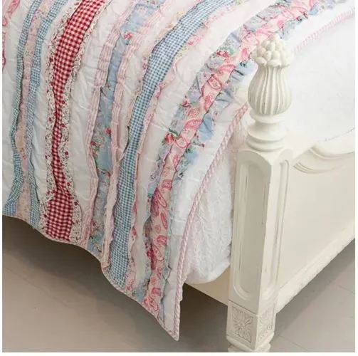 Soft pink cotton is quilted and pulled into sweet ruffles between light vintage prints that create a lively ensemble in the Lizzie Collection. This handmade quilt is crafted using an assortment of fabrics and some of the fabrics are individually made by adding ruffles to it. A fun quilt for any girls room. Transforming your home into a haven of warmth comfort and style.