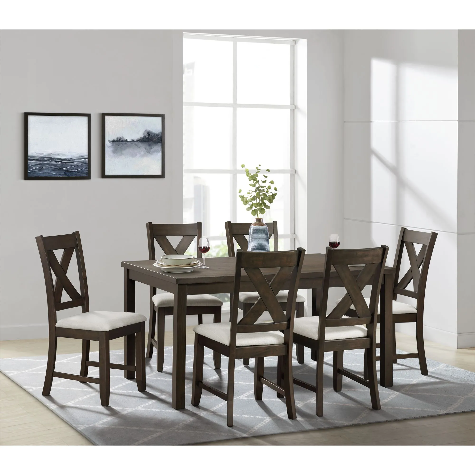 You have found the perfect dining room set to host your next home gathering with this charming expresso table and chairs set. Each chair is upholstered in a lovely white-grey fabric to comfortably seat each of your guests, while the cross back adds the right hint of farmhouse delight. Let this dining set fill your home with a central space that you treasure for years to come.