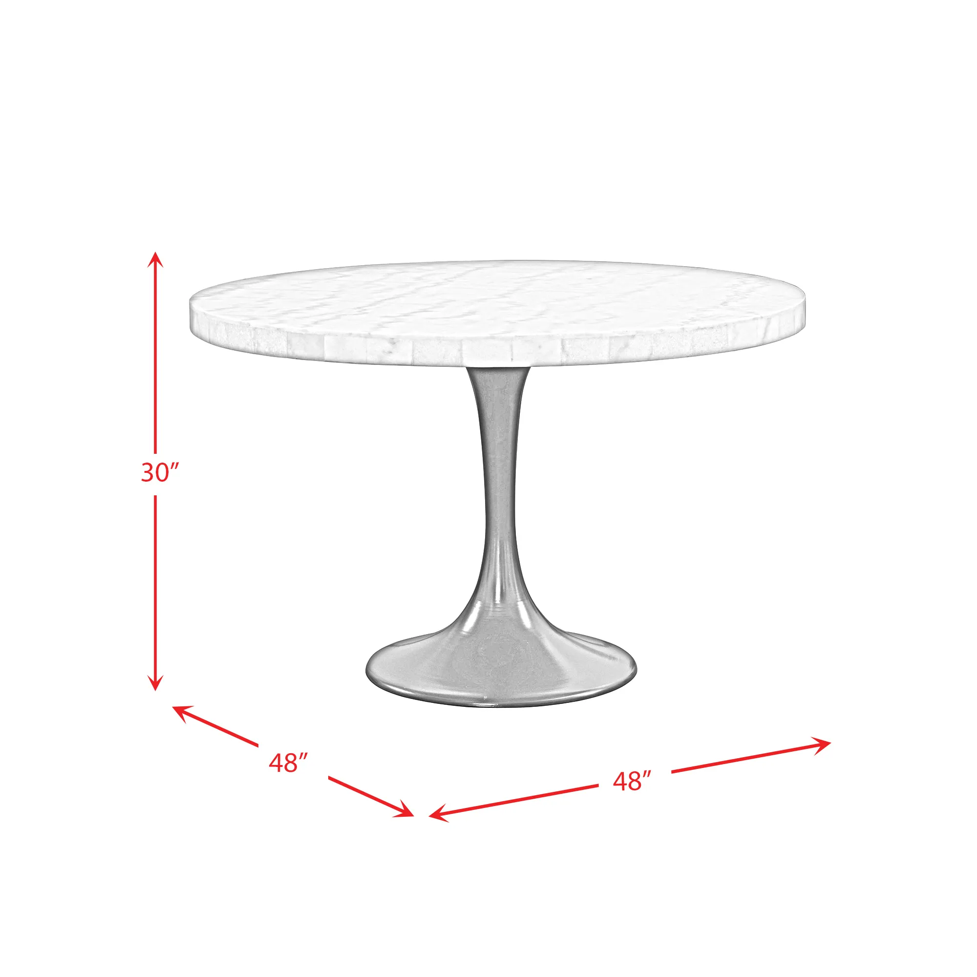 A Round Dining Table perfect for casual morning meals or for hosting small, intimate dinner parties. This table simultaneously brings function and contemporary fashion to any dining room with its clean, marble top and round table design. It is set on a sleek and sturdy metal pedestal base and is ideal for seating up to four people.