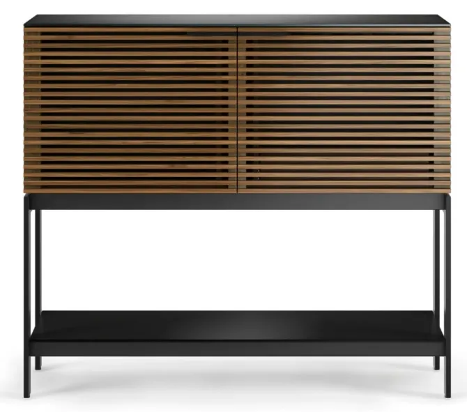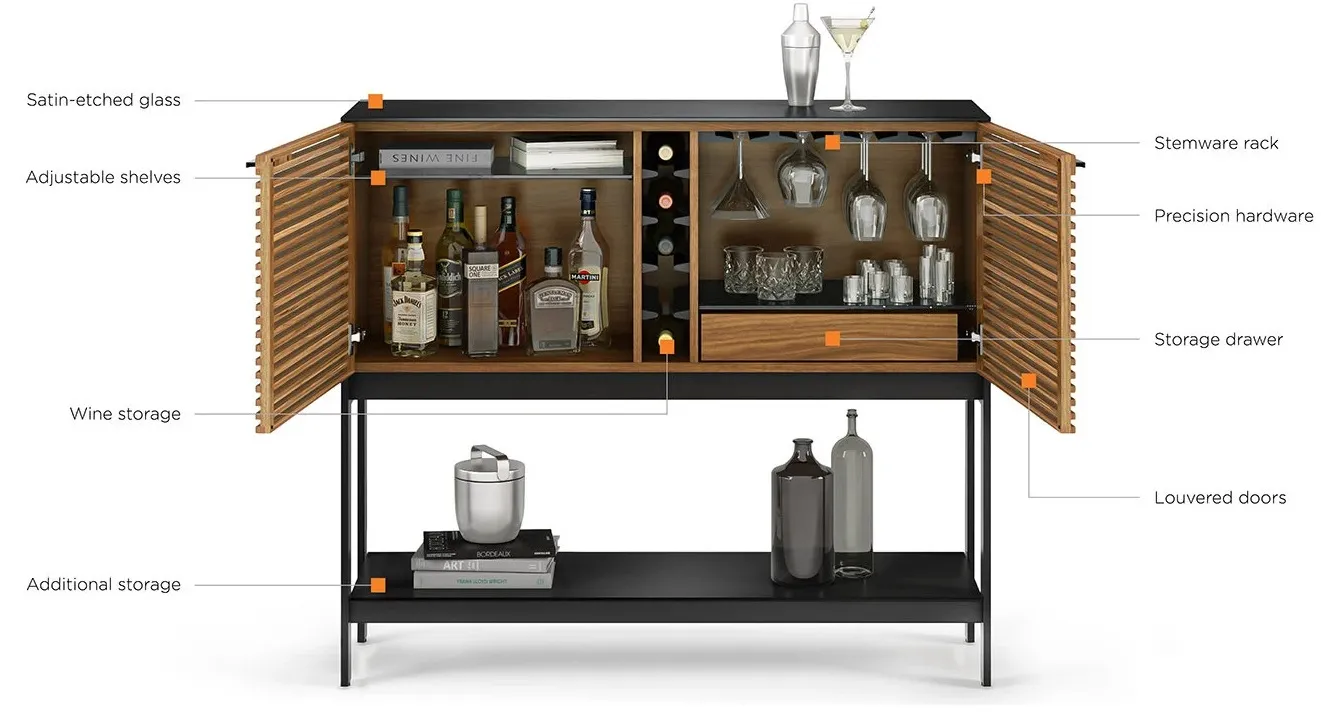 Hardwood louvered doors conceal everything a fully stocked bar needs, all within a sleek and slender design. Ample storage is available for an assortment of wine and liquor bottles, glassware, and other bar essentials. A wooden stemware rack keeps wine glasses organized and within reach.