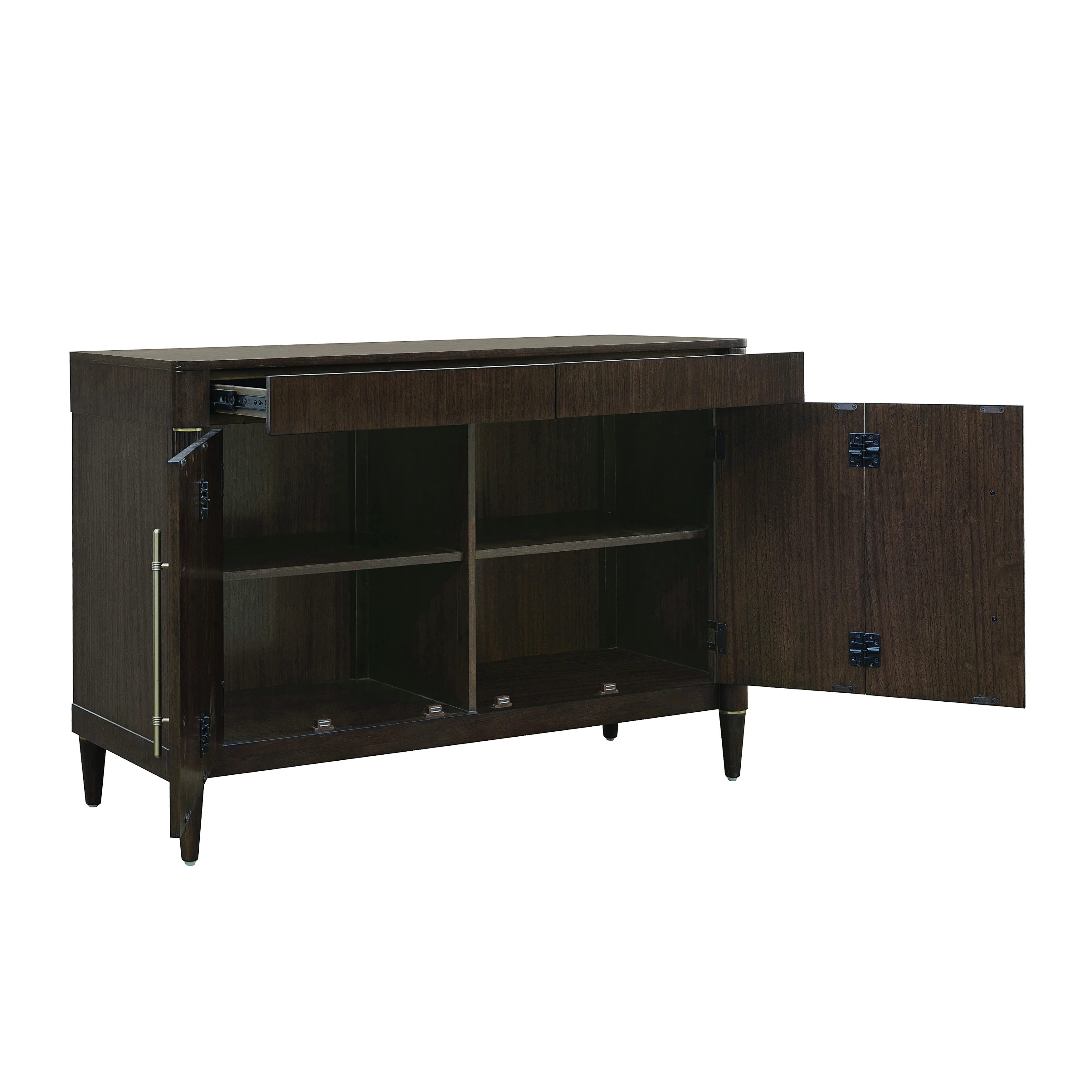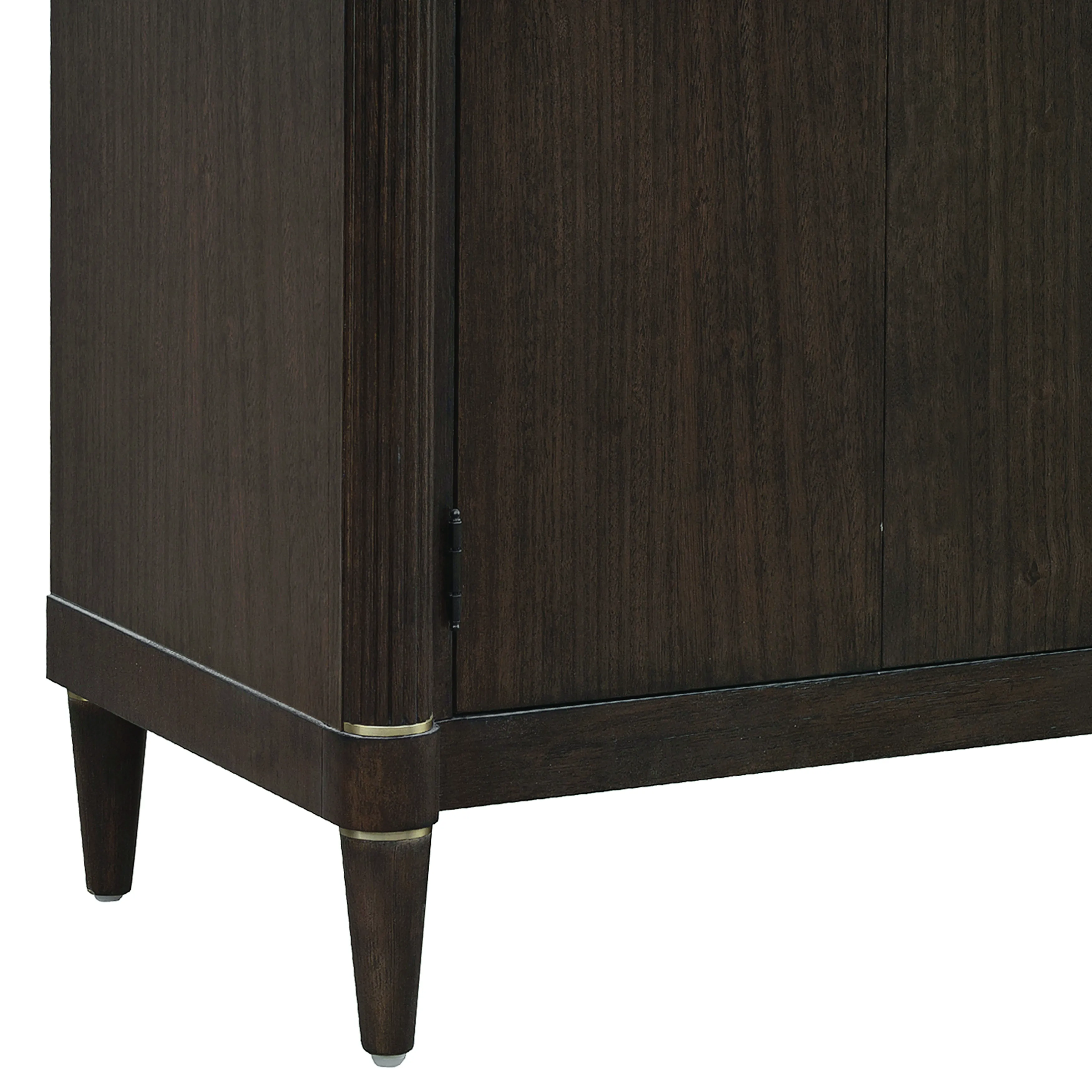 Enhance your dining space with the classic elegance of our Asher Park Two Door Server with Storage Drawers, thoughtfully designed for both beauty and functionality. Crafted from premium eucalyptus veneers in a rich Piano Brown finish, this server features wooden tapered legs and round reeded posts that evoke timeless architectural details. Metal collar accents in a soft brass finish add a touch of subtle glamour, perfectly complemented by custom soft brass bar pulls that bring refined sophistication to the doors. Ideal for storing serve ware, linens, or entertaining essentials, this server combines elegant form with practical storage.
