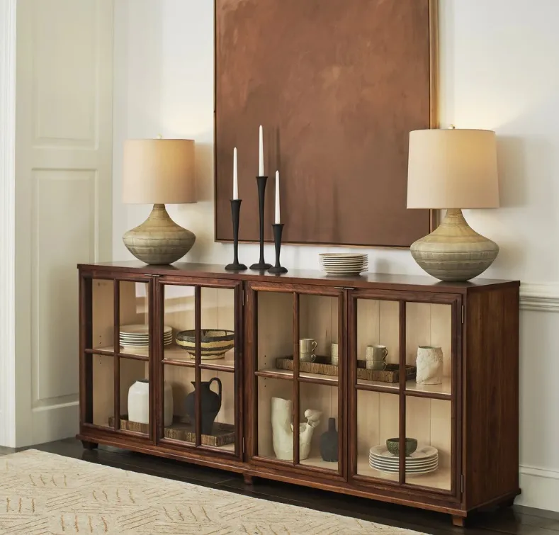 The spacious Hudson Valley Server is more than just a functional surface for serving and buffets. It's also a stunning display cabinet with a bright Natural Maple interior contrasting with its outer Dark Roast-finished walnut. Four glass doors are framed in walnut half-rounds and feature discreet flat pulls in Iron Gray, and the case sits low to the floor on six shaped feet.