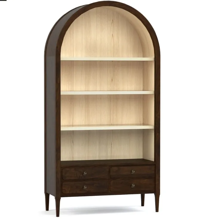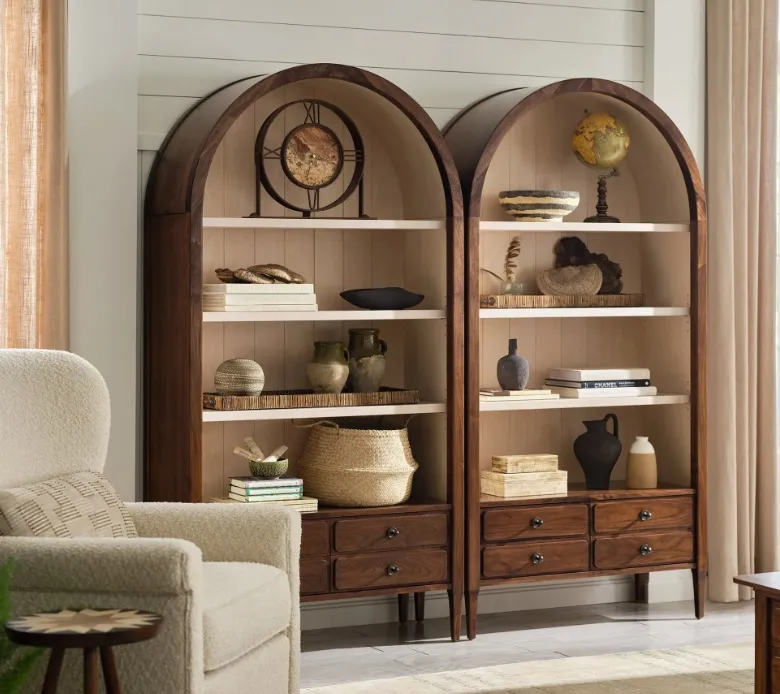The Hudson Valley Bookcase is immediately striking for its tall, arced shape and gorgeous contrasting tones. The outside of its curved case of solid American black walnut is finished in deep Dark Roast, while the interior, including a grooved back panel, fixed top shelf, and two adjustable shelves, is a cheerful Natural Maple. Complete with two deep drawers with faux double faces, this versatile piece works beautifully as shelving for the living room, office, bedroom, or dining room.