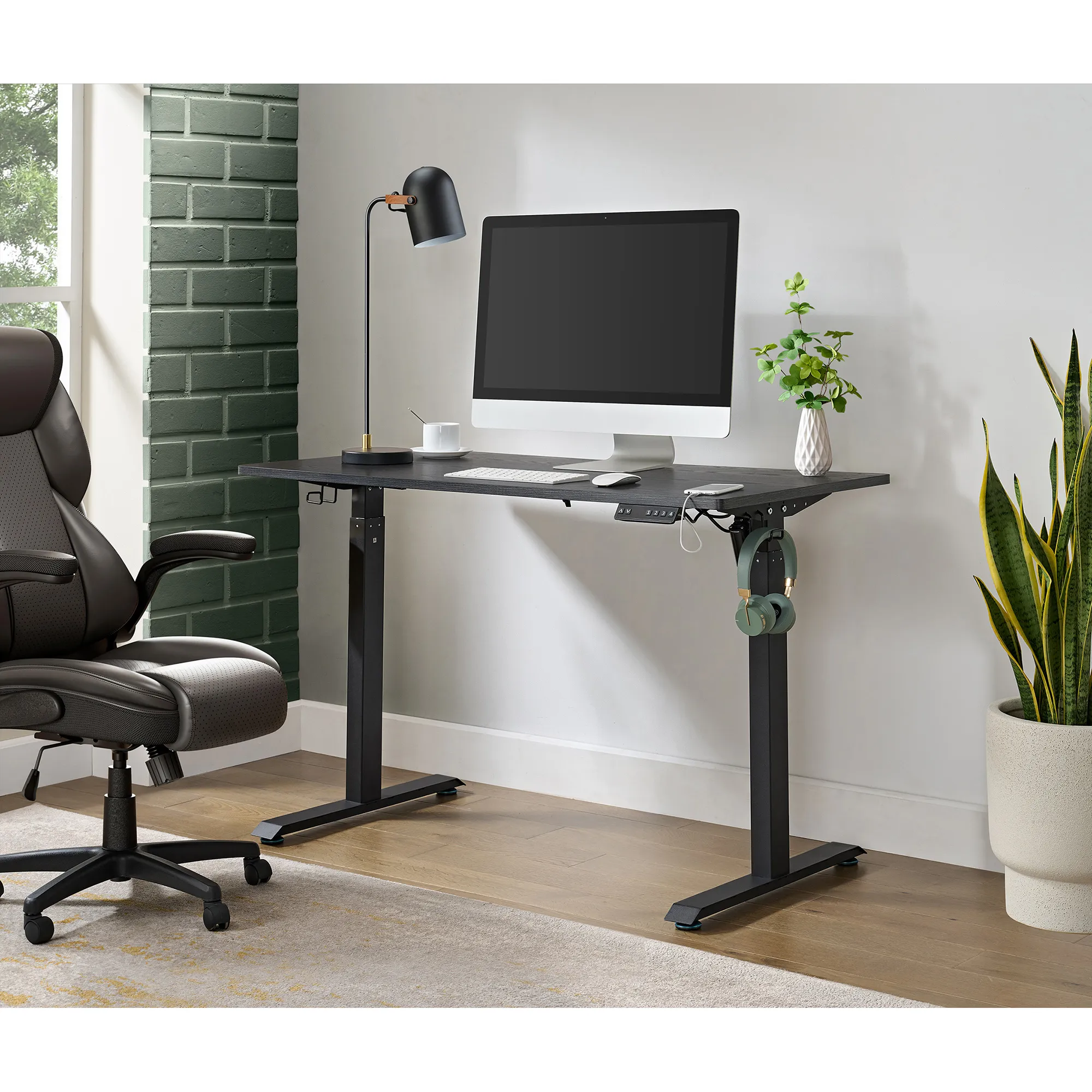 Elevate your workspace with the Oakland Desk, designed for the modern professional. Crafted with a sturdy powder-coated steel frame, this desk offers durability and style. Its height-adjustable mechanism and programmable heights allow seamless transitions from sitting to standing, promoting a healthier work routine. Stay powered up with built-in USB chargers, including a USB-C port, and keep your space clutter-free with thoughtful cable management. The spacious desktop surface accommodates all your essentials, while two headphone holders and anti-skid feet add convenience and stability. The Oakland Desk is where functionality meets sophistication, transforming any space into an efficient and stylish work hub.
