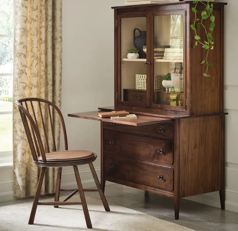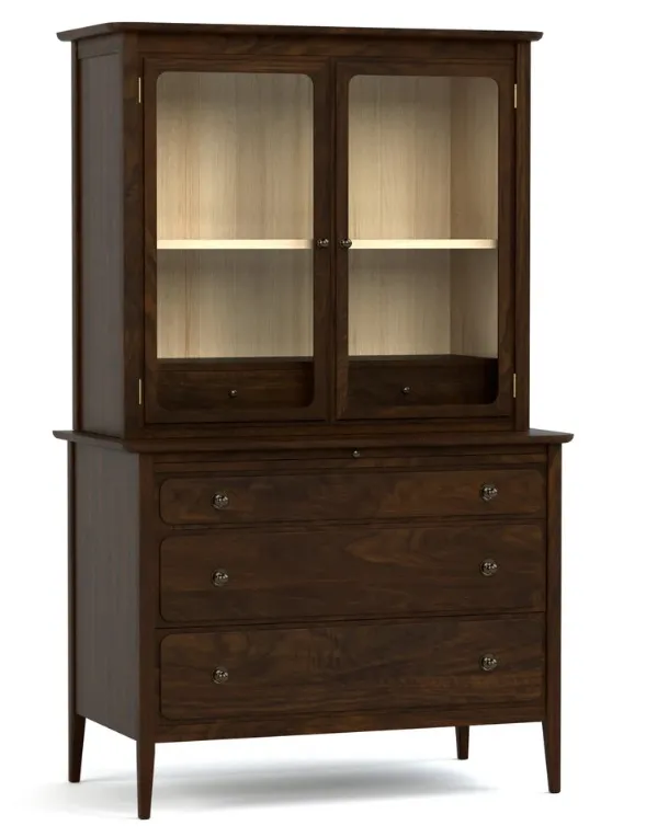 In this versatile solid-walnut piece, what appears to be a simple chest conceals an unexpected feature. Just below its slightly overhanging top, softened with radiused edges, a shelf pulls out to create a wide, functional desktop with generous work space. Beneath it, a false drawer-front drops down to reveal a compartment with a power strip for electronics. Two spacious drawers provide storage and are completed with shaped metal pulls in Iron Gray, complementing the case's Dark Roast finish. The chest can be paired with the Hudson Valley Two-Door Hutch.