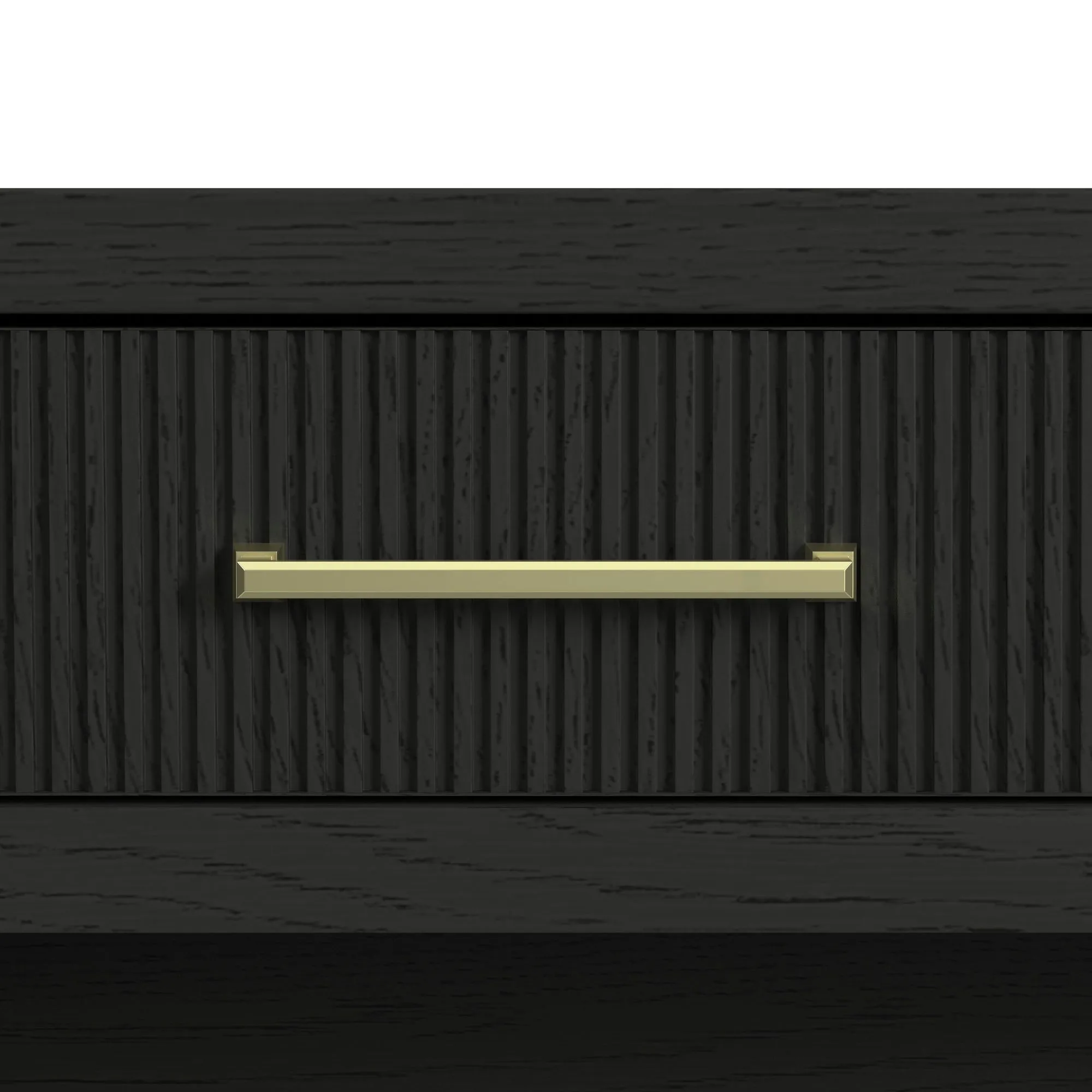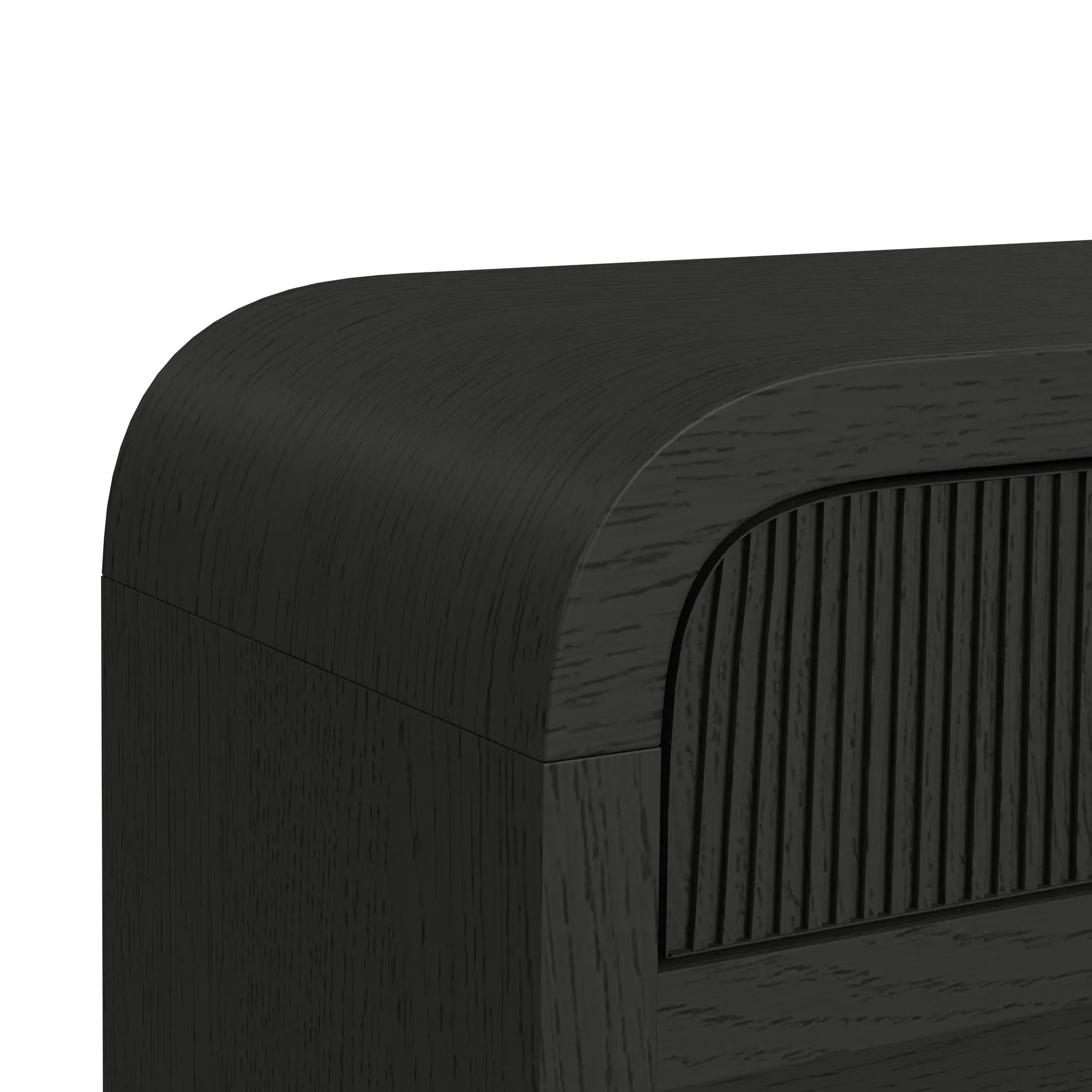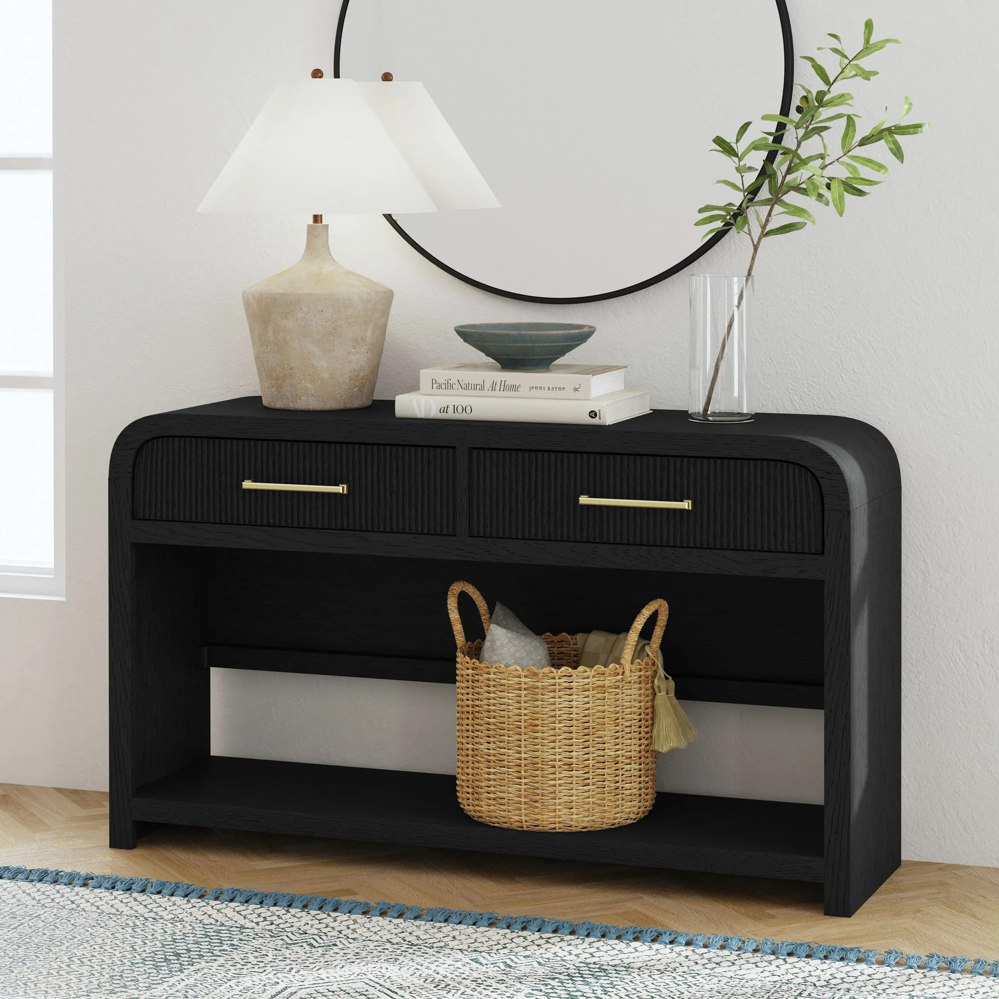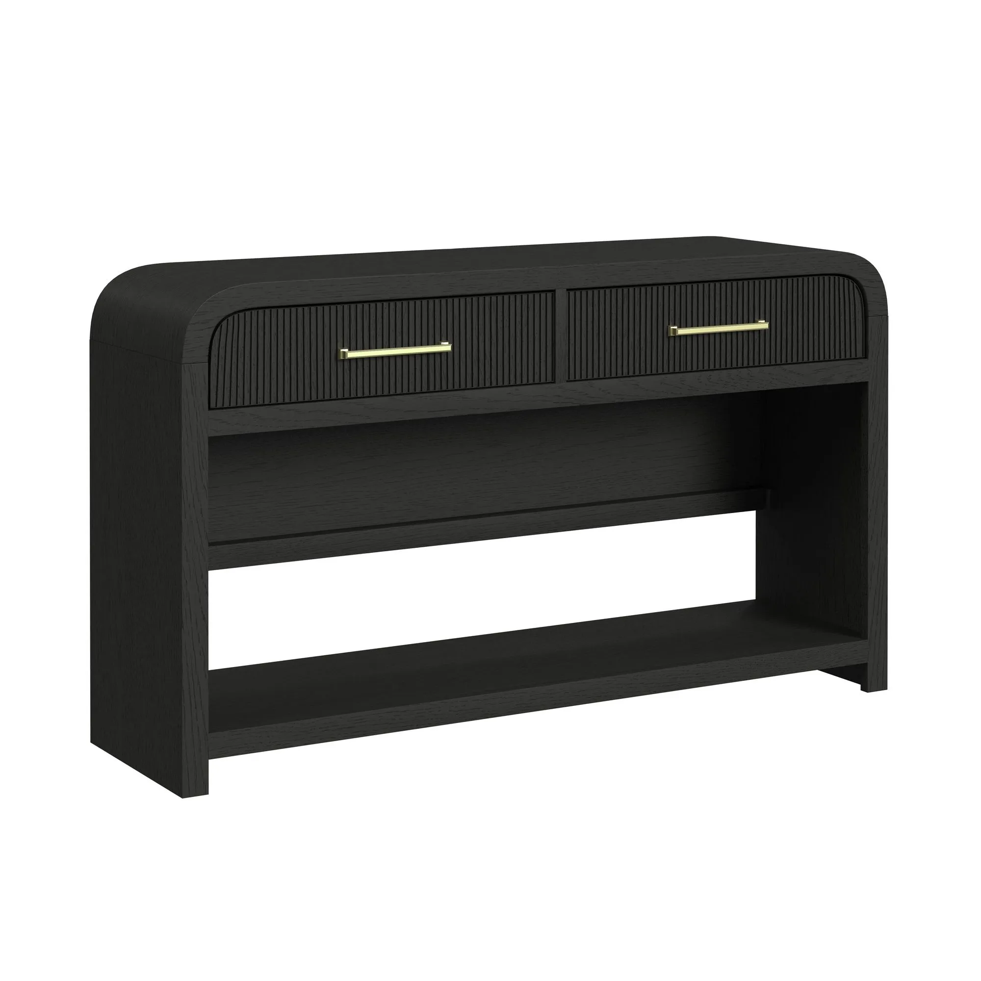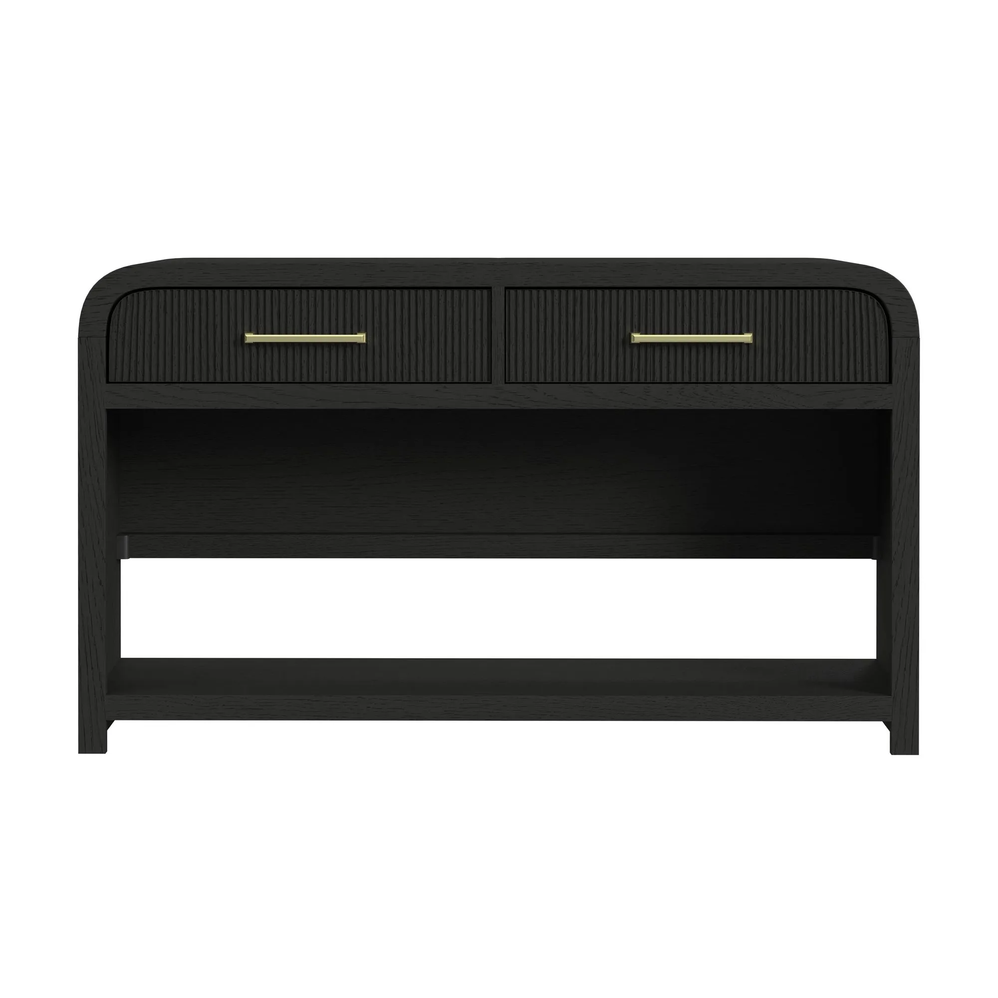 Accent your living room with the Ridgemont Sofa Table’s sleek and polished design. Crafted with delicately rounded corners, the tabletop’s broad surface is complemented by an equally spacious open shelf, extending your storage and display options. Lustrous metal handles adorning intricately fluted drawer fronts elevate the piece's visual appeal, while ball-bearing glides ensure ease of utility. Designed for those seeking to add a refined touch of luxury to their space, the Ridgemont Sofa Table is the perfect fit.