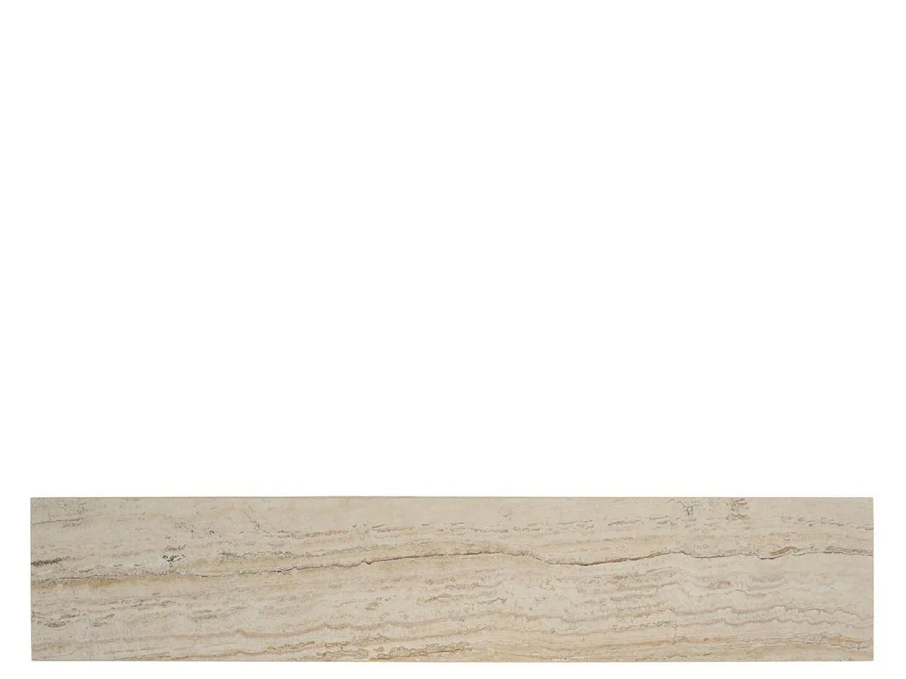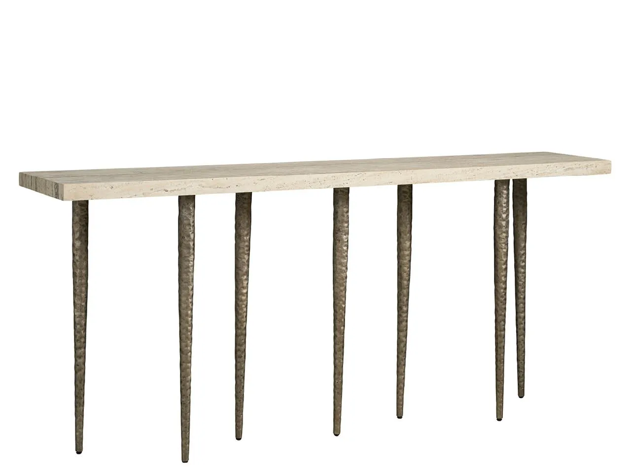 The Lowry Console is a striking piece of modern design that celebrates the interplay of positive and negative space. Its slender, nickel-finished metal legs create an airy, almost ethereal quality, while the solid white travertine top provides a grounding element. This bold combination of materials and minimalist design makes the Lowry Console a captivating focal point for any hallway or entryway.
