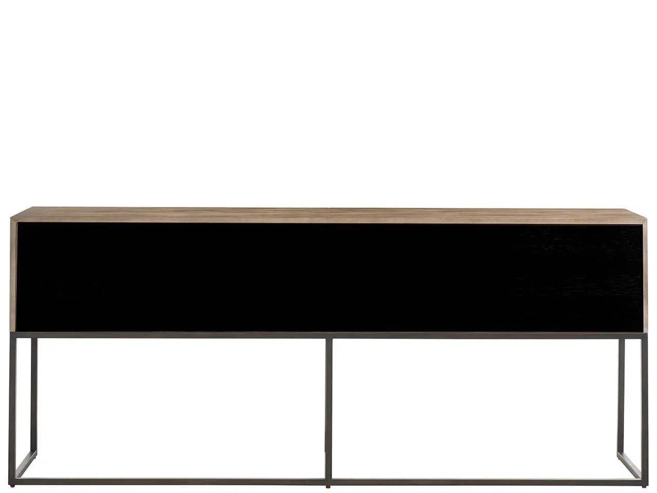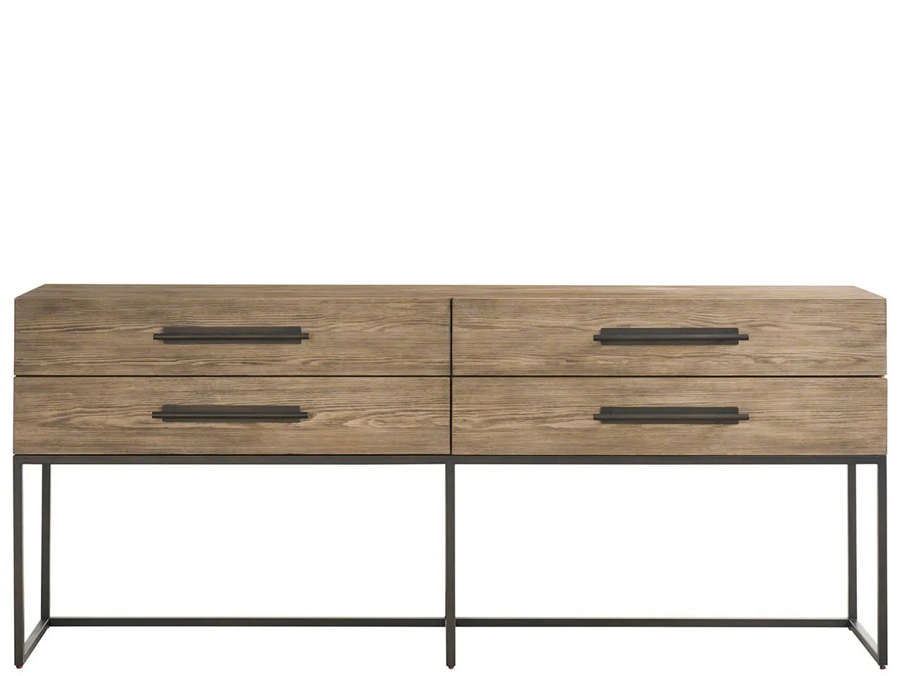 The Boulder Metal Base Console blends industrial chic with natural warmth. Featuring a sleek metal base and a warm Boulder medium-brown finish, its clean lines and four spacious drawers offer both style and functionality. This console adds a modern, architectural touch to your entryway, living room, or dining area, perfect for those seeking a blend of contemporary design and practical storage.