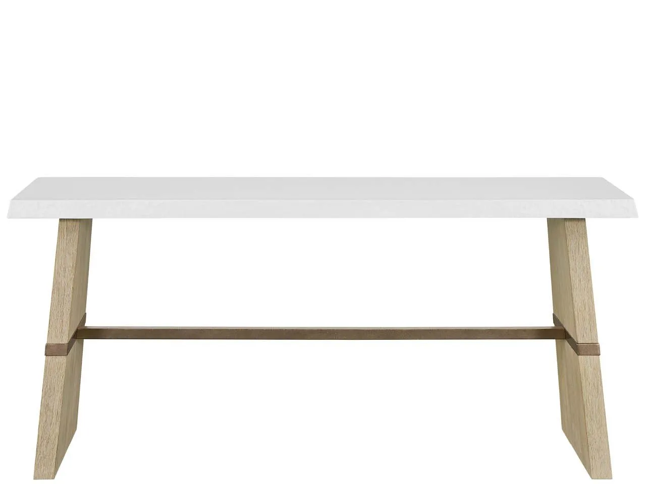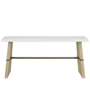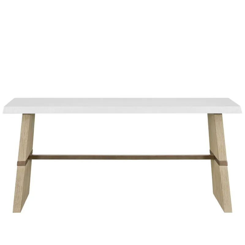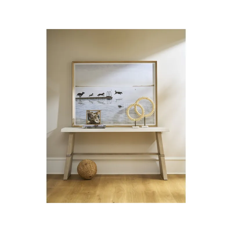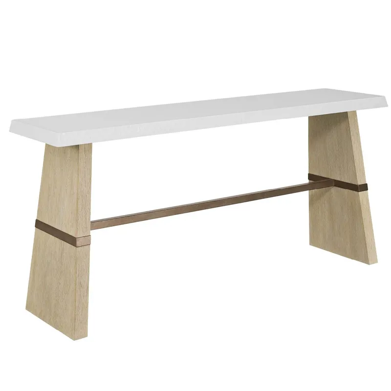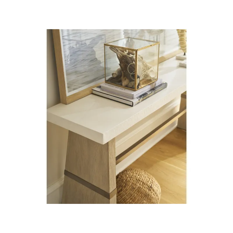 The Dockside Console Table features a white concrete top with textured edge and warm oak legs set apart by an Aged Pewter metal stretcher. These mixed materials create a striking entry or sofa table that perfectly embodies the collection's relaxed coastal sophistication.