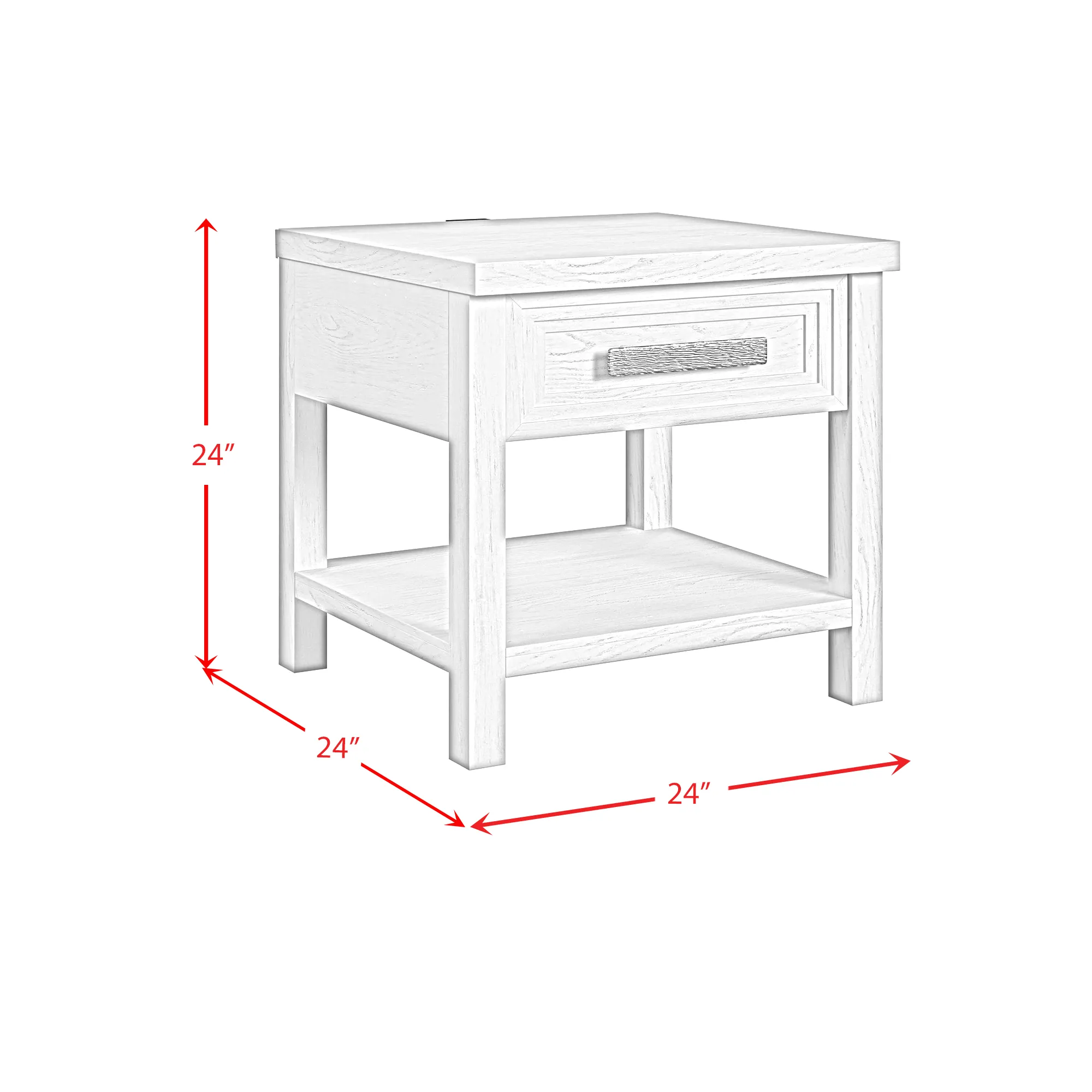 Define your living space with the transitional style of the Avalanche End Table. Constructed of quality solid and engineered wood, the tabletop’s broad surface is complemented by an equally spacious open shelf, effortlessly extending your storage and display options. Designed for practical use, a functional drawer adorned with a broad, textured handle features protective felt lining and skillful French and English dovetailing, while a conveniently integrated USB port lends itself to practical utility. For a sleek and stylish addition to your home, the Avalanche End Table in Antique White delivers in quality and design.