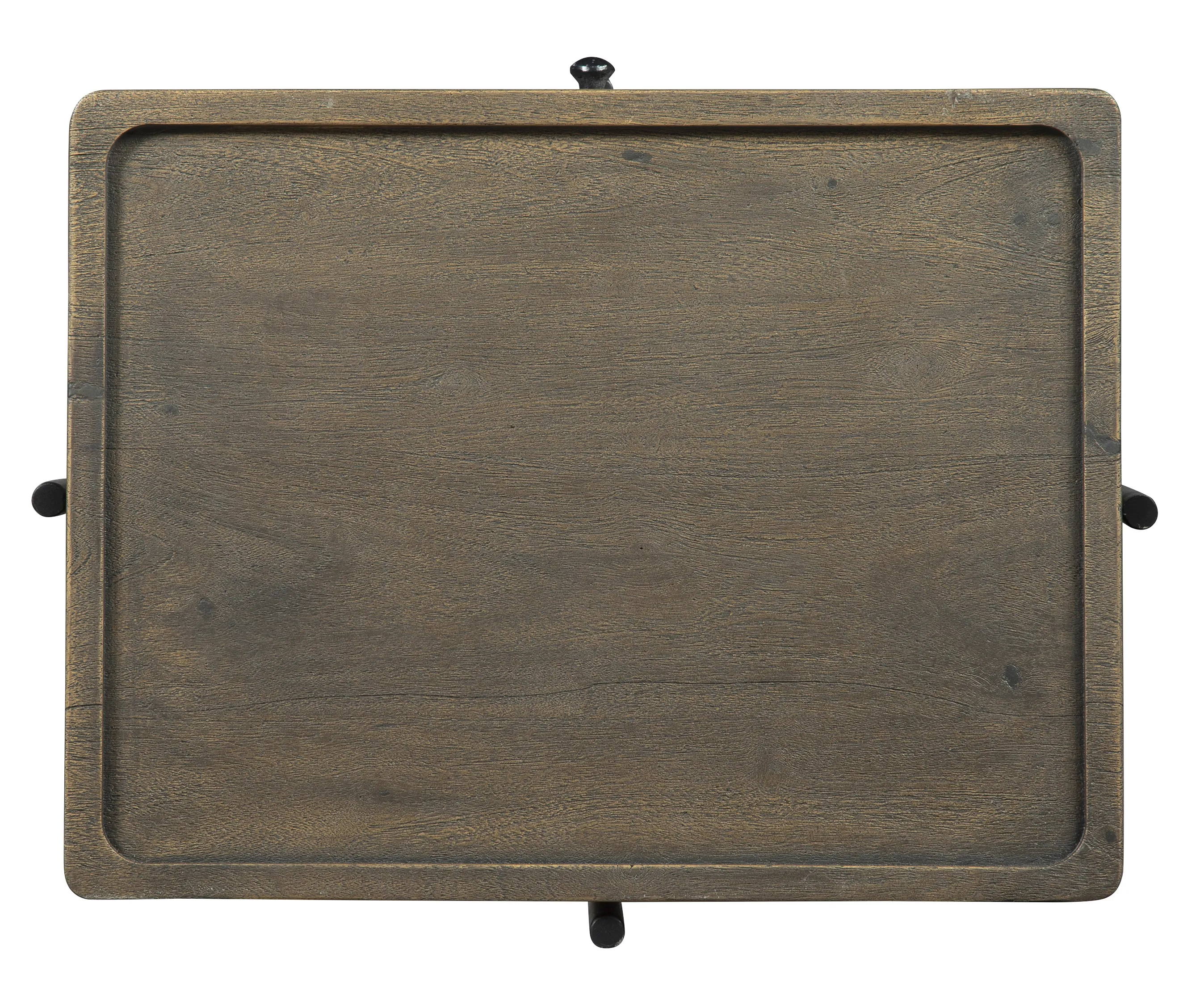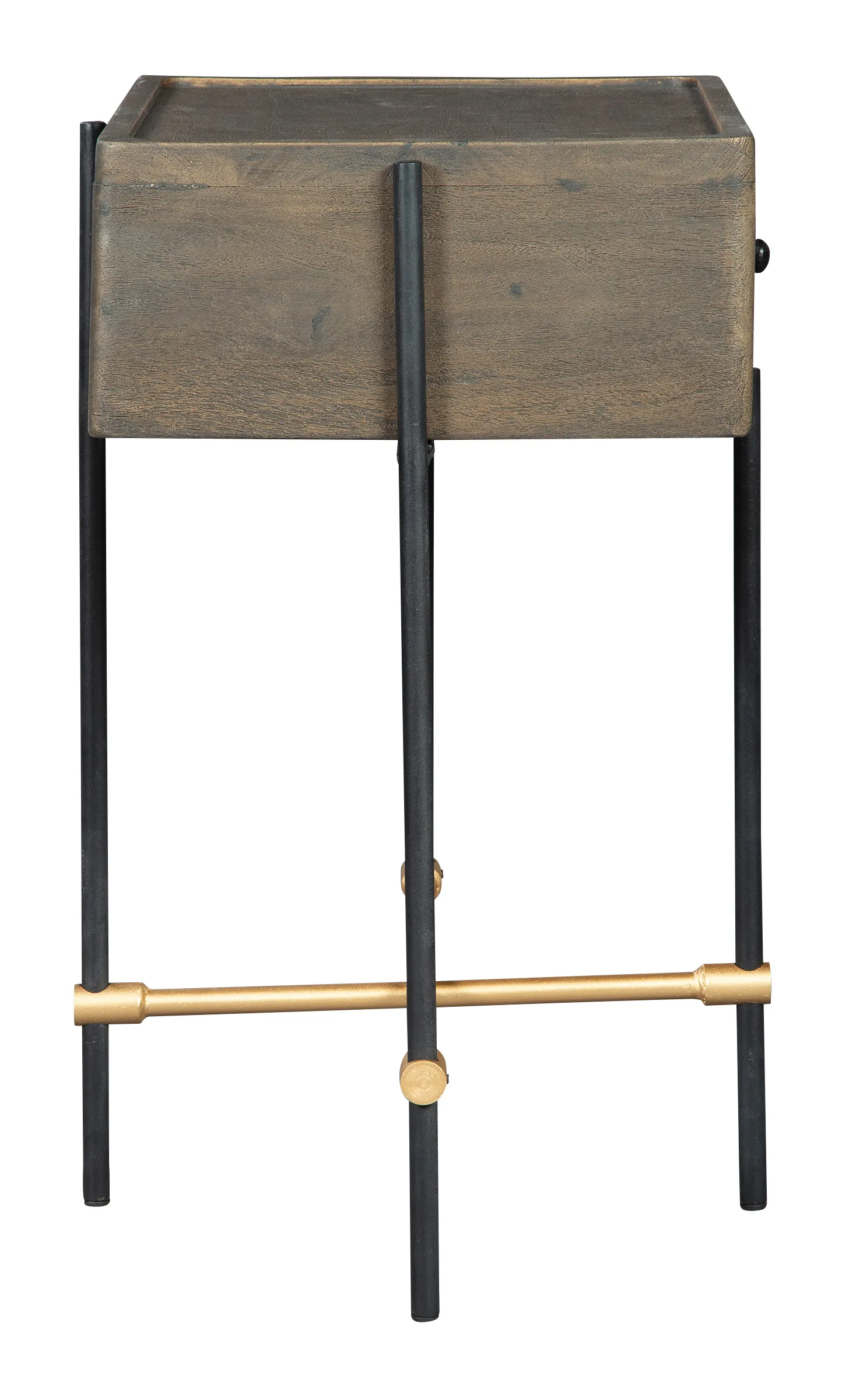 - This chairside table is comprised of a drawer box of solid acacia. The architectural design features round iron legs cradling the rectangular drawer box.