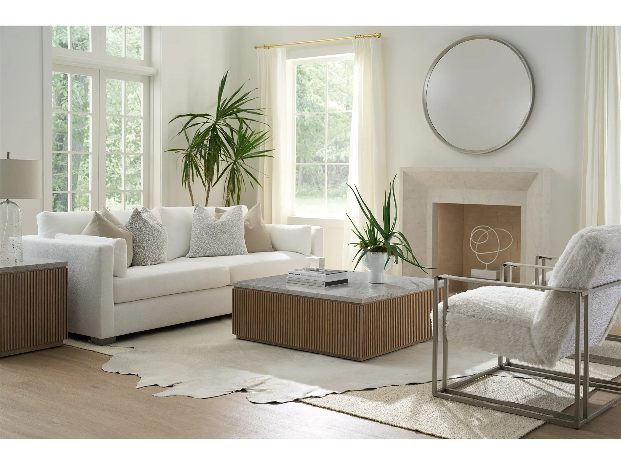 The Carmen Side Table, a striking piece of furniture, combines sleek lines with a unique square silhouette. Its textured, vertical design, reminiscent of natural elements, is juxtaposed with a smooth stone top. This captivating contrast and its versatile design make it a perfect addition to any interior space.