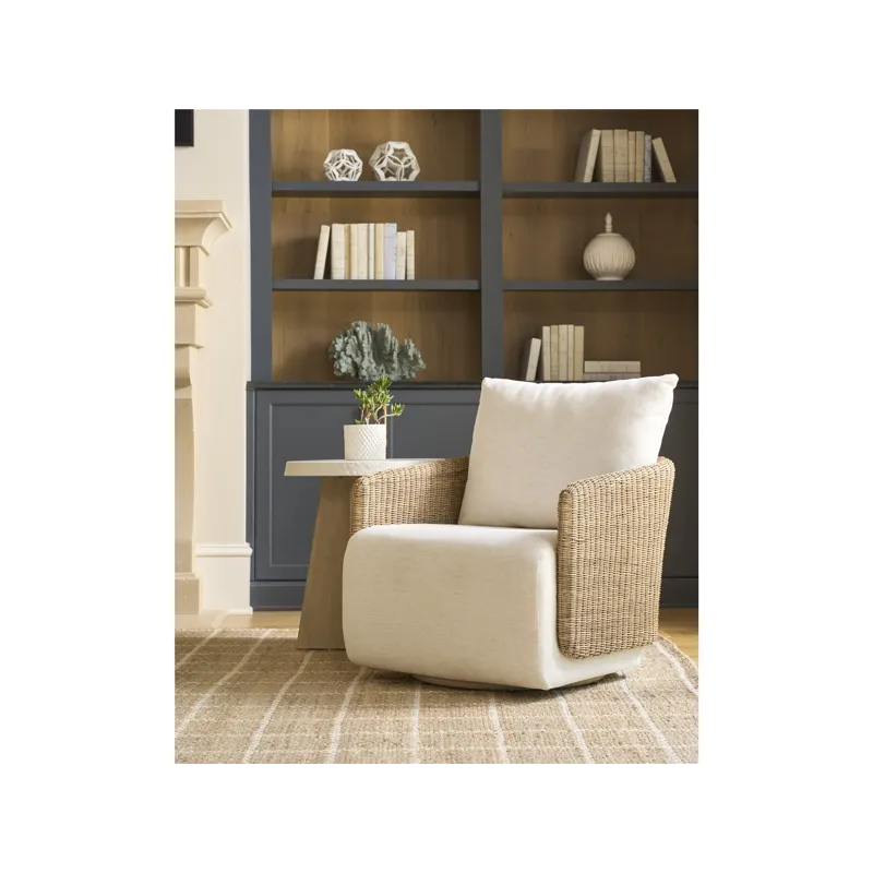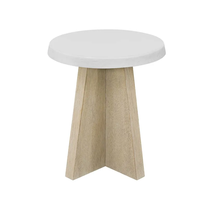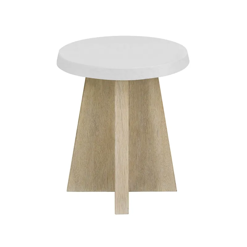 The Dockside Accent Table features a white concrete top with textured edge sitting atop an oak tripod base. The contrasting materials create a versatile side table that embodies the collection's blend of organic elements and refined coastal style.