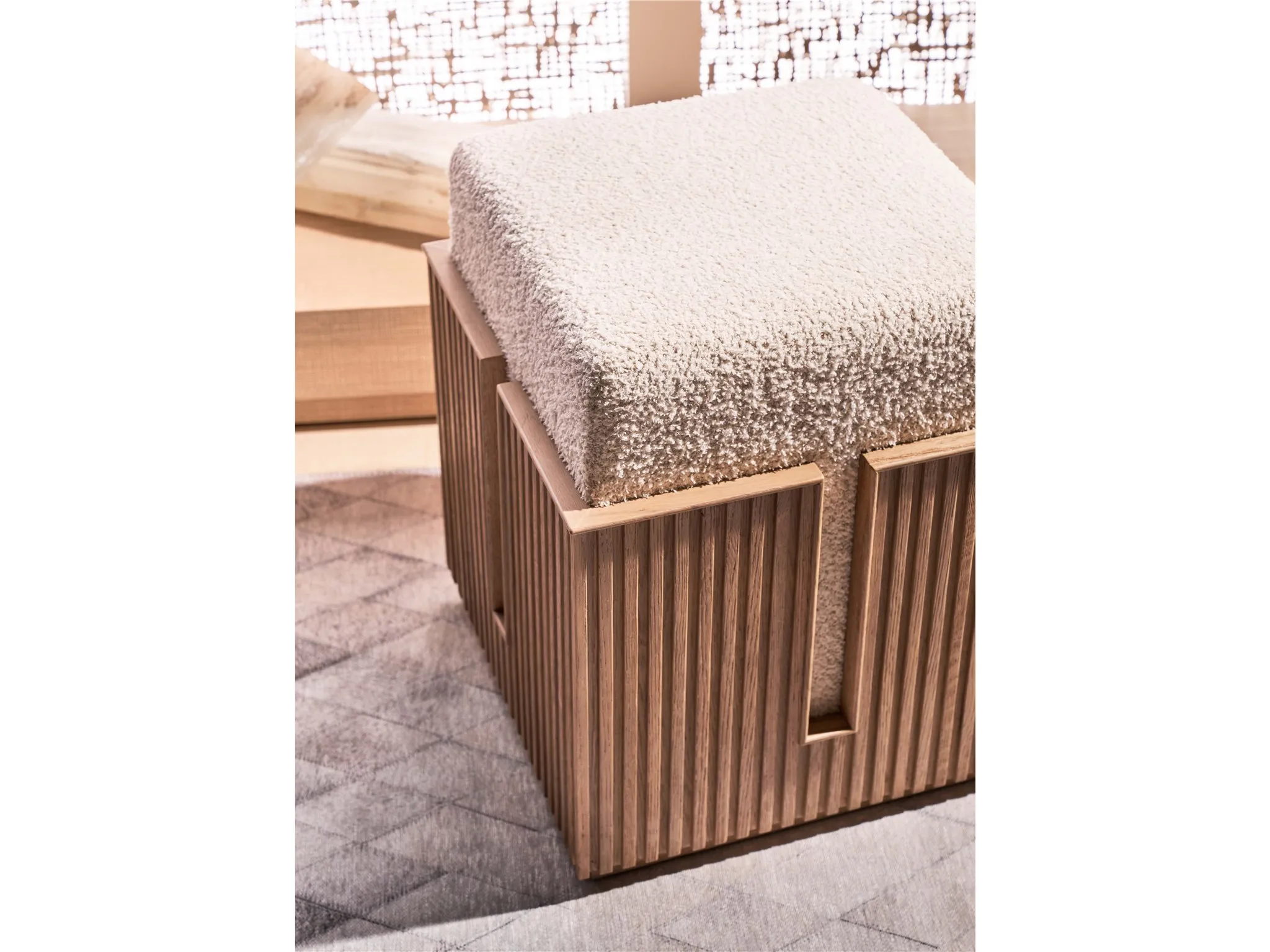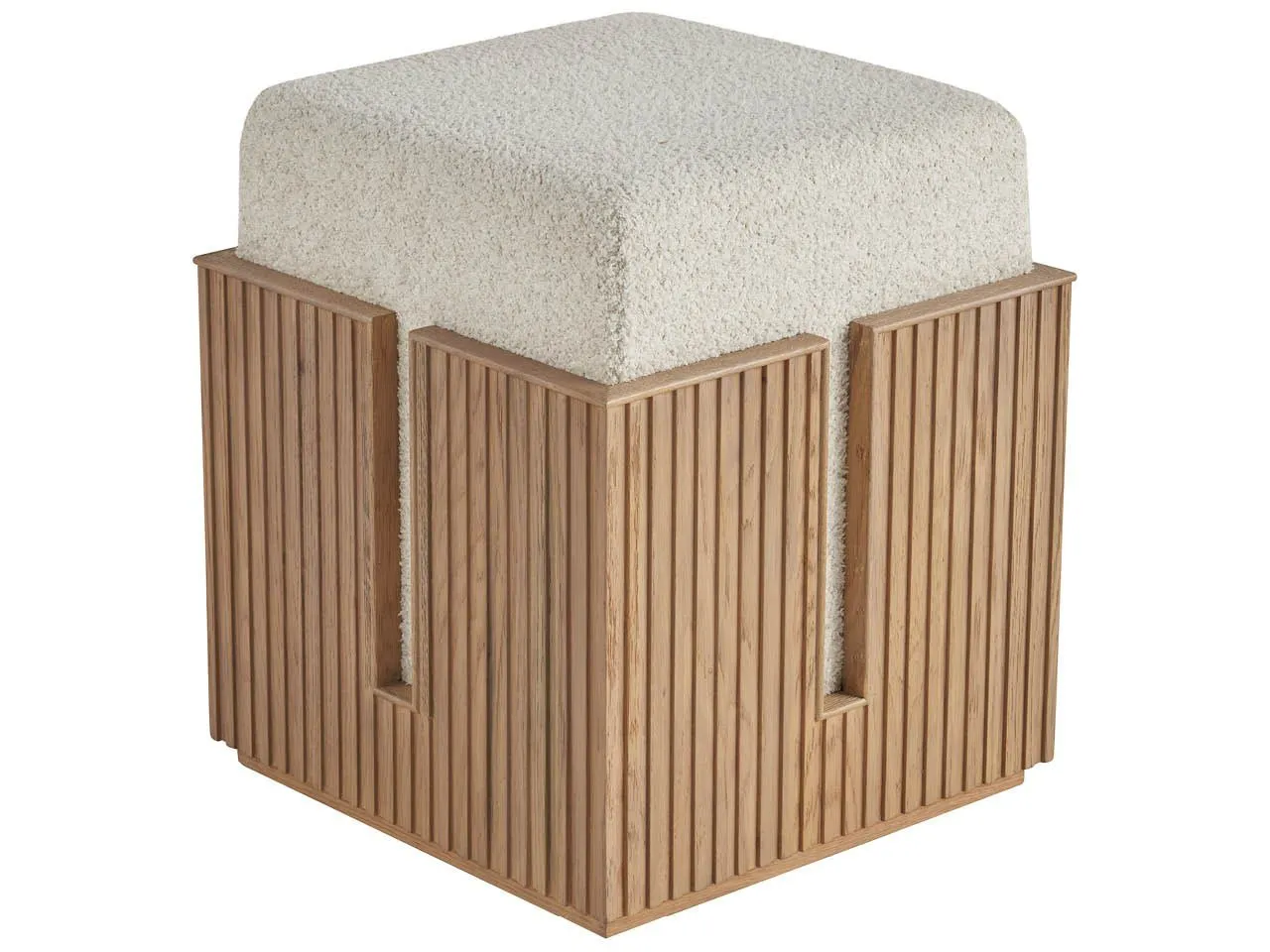 The Carmen Bunching Stool, a harmonious blend of form and function, is a versatile addition to any space. Its tambour-wrapped base, finished in a striking Skylark hue, adds a touch of modern elegance. The cozy, upholstered top, wrapped in Sheldon Ivory fabric, provides a comfortable seating option.