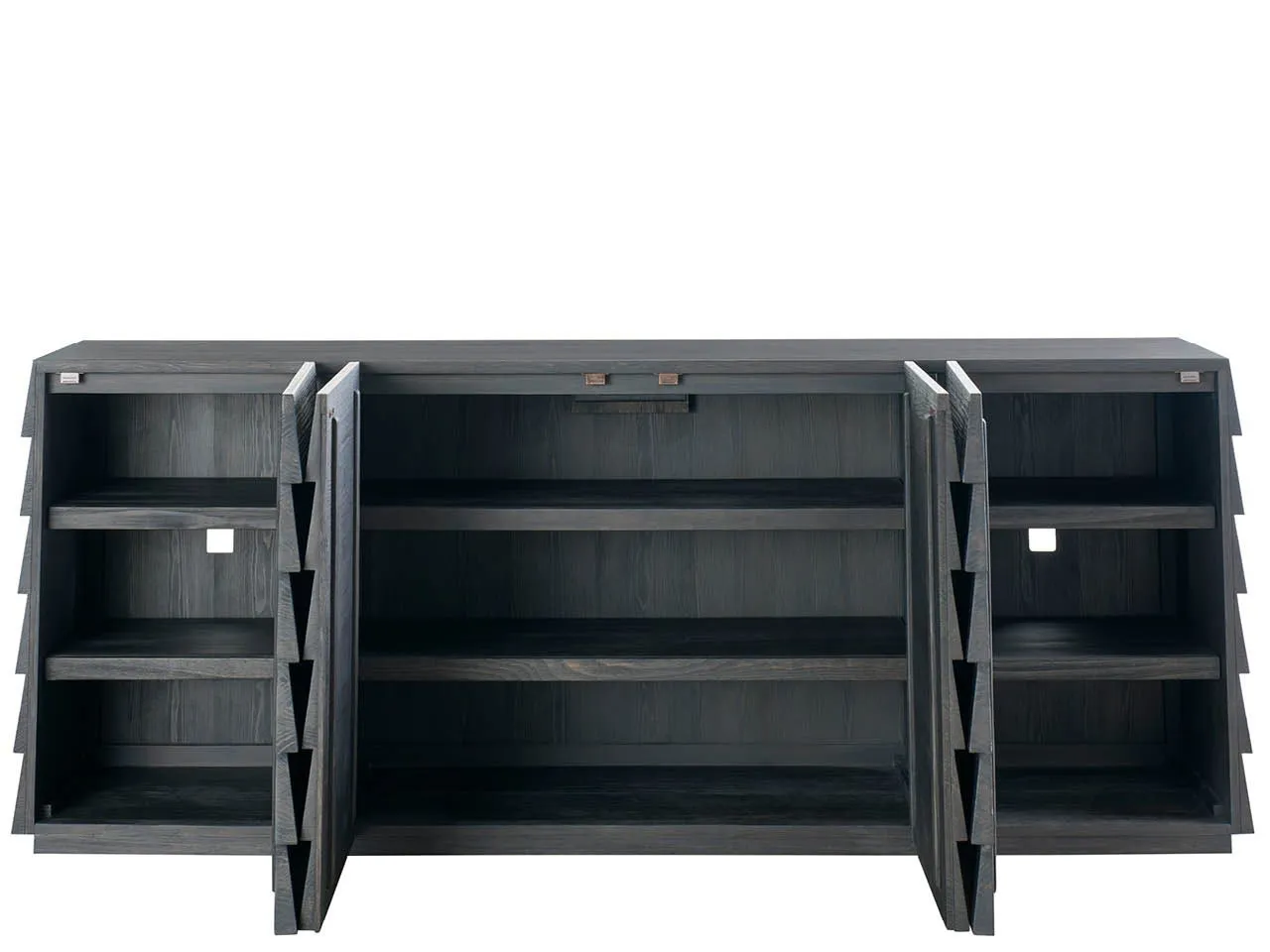 The Basalt Lap Credenza makes a bold statement with its striking layered design and dramatic Basalt finish. The overlapping panels create a sense of depth and texture, adding a contemporary, sculptural element to your space. This credenza offers ample storage with a touch of architectural intrigue, making it a sophisticated focal point for any dining or living area.