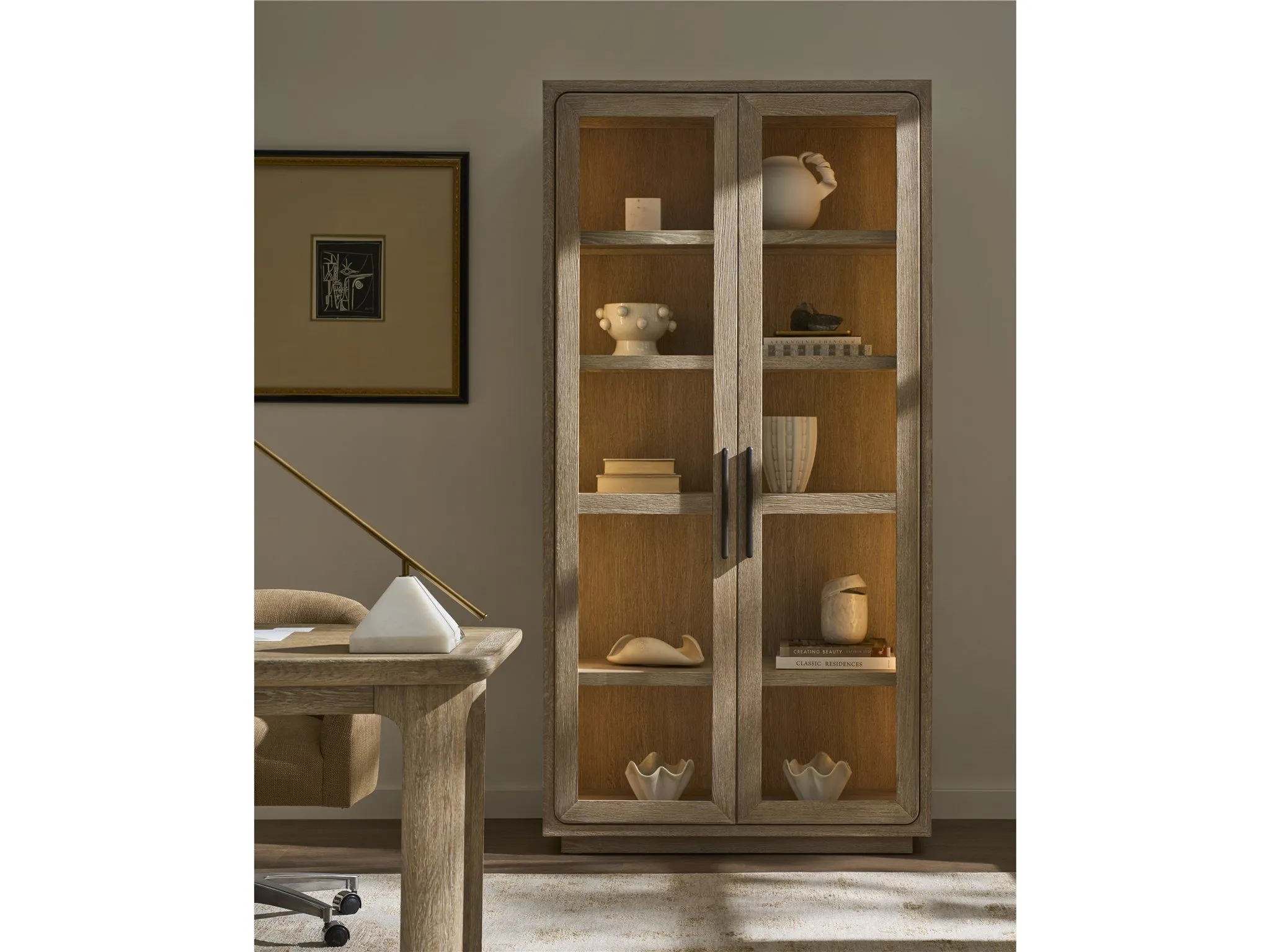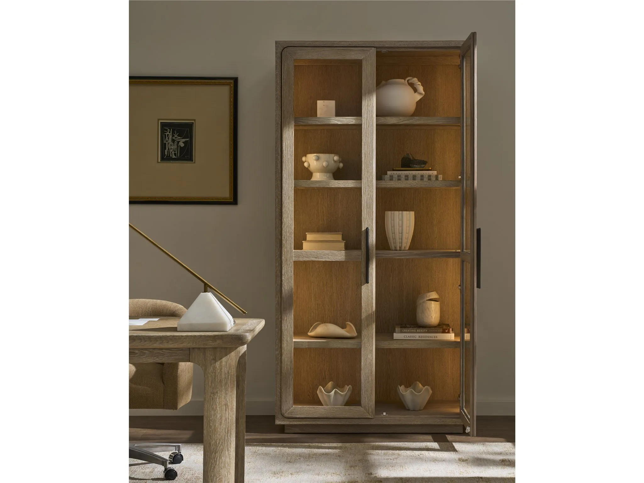 The Desert Display Cabinet adds a touch of timeless elegance to any living space. Its light Desert finish enhances the classic design, while the glass doors offer a glimpse of displayed treasures, making it a captivating focal point.