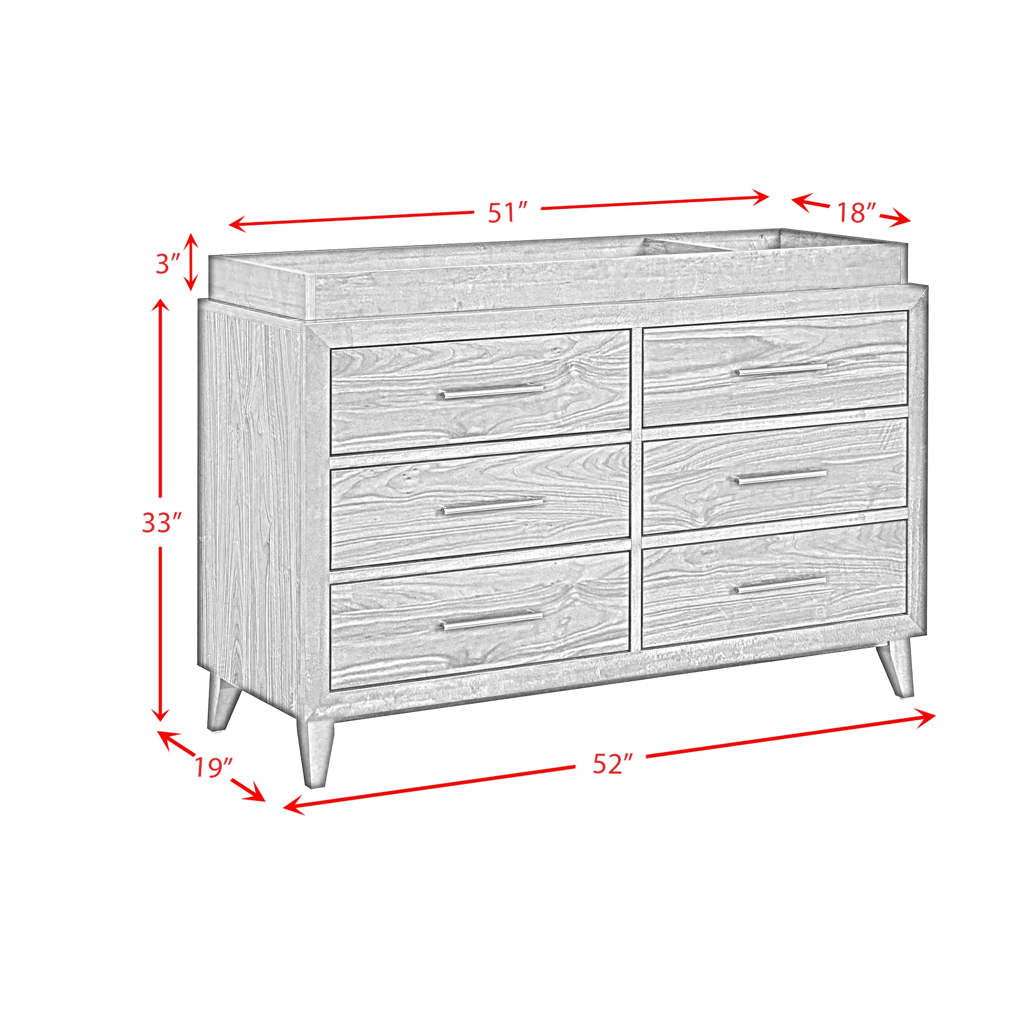 Decorate your nursery with the mid-century modern style of the Malia 6-Drawer Dresser and Topper. Built with solid poplar wood with a quality walnut veneer, this dresser doubles in function as a changing table. Six spacious drawers provide ample space for storing your baby’s essentials, while English dovetailing and smooth ball bearing drawer glides mark skillful craftsmanship. Sleek, brass colored metal handles and distinctly tapered feet add charming detail, while an included anti-tip kit enhances safety. For a durable, versatile, and stylish addition to your child’s nursery, the Malia 6-Drawer Dresser and Topper delivers.
